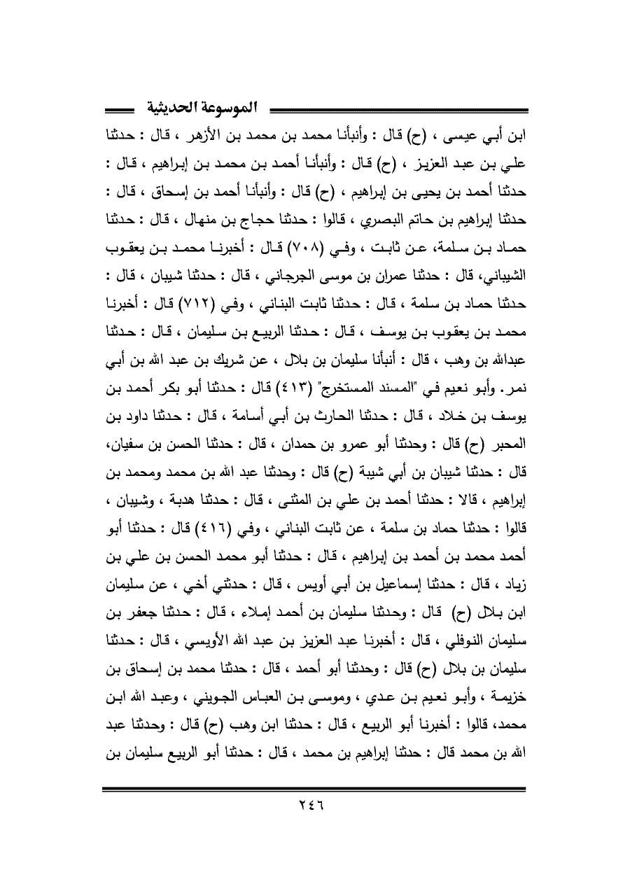 ابن أبي عيسى، (ح) قال: وأنبأنا محمد بن محمد بن الأزهر، قال: حدثنا علي بن عبد العزيز، (ح) قال: وأنبأنا أحمد بن محمد بن إبراهيم، قال: حدثنا أحمد بن يحيى بن إبراهيم، (ح) قال: وأنبأنا أحمد بن إسحاق، قال: حدثنا إبراهيم بن حاتم البصري، قالوا: حدثنا حجاج بن منهال، قال: حدثنا حماد بن سلمة، عن ثابت، وفي (٧٠٨) قال: أخبرنا محمد بن يعقوب الشيباني، قال: حدثنا عمران بن موسى الجرجاني، قال: حدثنا شيبان، قال: حدثنا حماد بن سلمة، قال: حدثنا ثابت البناني، وفي (٧١٢) قال: أخبرنا محمد بن يعقوب بن يوسف، قال: حدثنا الربيع بن سليمان، قال: حدثنا عبد اللَّه بن وهب، قال: أنبأنا سليمان بن بلال، عن شريك بن عبد اللَّه بن أبي نمر. وأبو نعيم في "المسند المستخرج" (٤١٣) قال: حدثنا أبو بكر أحمد بن يوسف بن خلاد، قال: حدثنا الحارث بن أبي أسامة، قال: حدثنا داود بن المحبر (ح) قال: وحدثنا أبو عمرو بن حمدان، قال: حدثنا الحسن بن سفيان، قال: حدثنا شيبان بن أبي شيبة (ح) قال: وحدثنا عبد اللَّه بن محمد ومحمد بن إبراهيم، قالا: حدثنا أحمد بن علي بن المثنى، قال: حدثنا هدبة، وشيبان، قالوا: حدثنا حماد بن سلمة، عن ثابت البناني، وفي (٤١٦) قال: حدثنا أبو أحمد محمد بن أحمد بن إبراهيم، قال: حدثنا أبو محمد الحسن بن علي بن زياد، قال: حدثنا إسماعيل بن أبي أويس، قال: حدثني أخي، عن سليمان ابن بلال (ح) قال: وحدثنا سليمان بن أحمد إملاء، قال: حدثنا جعفر بن سليمان النوفلي، قال: أخبرنا عبد العزيز بن عبد اللَّه الأويسي، قال: حدثنا سليمان بن بلال (ح) قال: وحدثنا أبو أحمد، قال: حدثنا محمد بن إسحاق بن خزيمة، وأبو نعيم بن عدي، وموسى بن العباس الجويني، وعبد اللَّه ابن محمد، قالوا: أخبرنا أبو الربيع، قال: حدثنا ابن وهب (ح) قال: وحدثنا عبد اللَّه بن محمد قال: حدثنا إبراهيم بن محمد، قال: حدثنا أبو الربيع سليمان بن