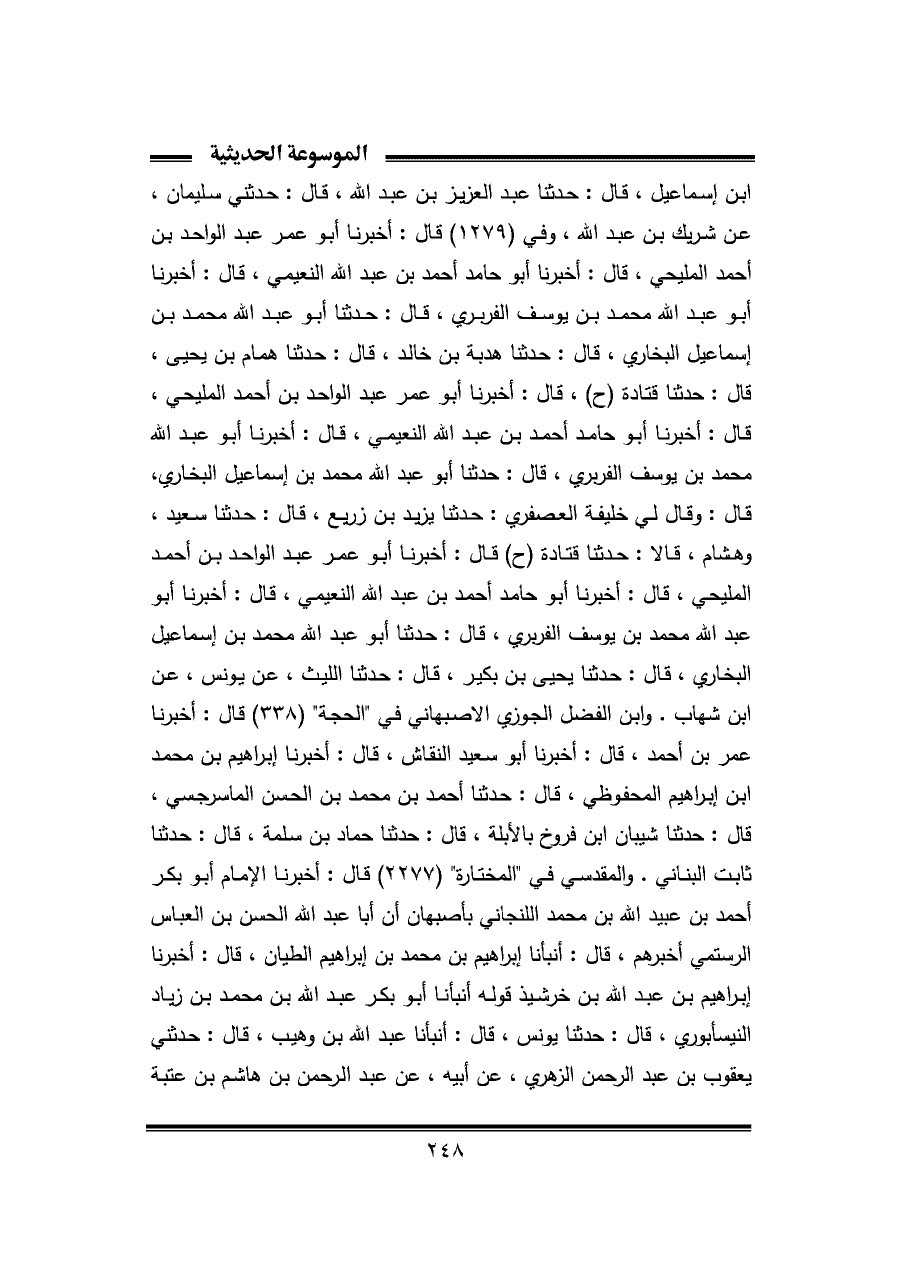 ابن إسماعيل، قال: حدثنا عبد العزيز بن عبد اللَّه، قال: حدثني سليمان، عن شريك بن عبد اللَّه، وفي (١٢٧٩) قال: أخبرنا أبو عمر عبد الواحد بن أحمد المليحي، قال: أخبرنا أبو حامد أحمد بن عبد اللَّه النعيمي، قال: أخبرنا أبو عبد اللَّه محمد بن يوسف الفربري، قال: حدثنا أبو عبد اللَّه محمد بن إسماعيل البخاري، قال: حدثنا هدبة بن خالد، قال: حدثنا همام بن يحيى، قال: حدثنا قتادة (ح)، قال: أخبرنا أبو عمر عبد الواحد بن أحمد المليحي، قال: أخبرنا أبو حامد أحمد بن عبد اللَّه النعيمي، قال: أخبرنا أبو عبد اللَّه محمد بن يوسف الفربري، قال: حدثنا أبو عبد اللَّه محمد بن إسماعيل البخاري، قال: وقال لي خليفة العصفري: حدثنا يزيد بن زريع، قال: حدثنا سعيد، وهشام، قالا: حدثنا قتادة (ح) قال: أخبرنا أبو عمر عبد الواحد بن أحمد المليحي، قال: أخبرنا أبو حامد أحمد بن عبد اللَّه النعيمي، قال: أخبرنا أبو عبد اللَّه محمد بن يوسف الفربري، قال: حدثنا أبو عبد اللَّه محمد بن إسماعيل البخاري، قال: حدثنا يحيى بن بكير، قال: حدثنا الليث، عن يونس، عن ابن شهاب. وابن الفضل الجوزي الاصبهاني في "الحجة" (٣٣٨) قال: أخبرنا عمر بن أحمد، قال: أخبرنا أبو سعيد النقاش، قال: أخبرنا إبراهيم بن محمد ابن إبراهيم المحفوظي، قال: حدثنا أحمد بن محمد بن الحسن الماسرجسي، قال: حدثنا شيبان ابن فروخ بالأبلة، قال: حدثنا حماد بن سلمة، قال: حدثنا ثابت البناني. والمقدسي في "المختارة" (٢٢٧٧) قال: أخبرنا الإمام أبو بكر أحمد بن عبيد اللَّه بن محمد اللنجاني بأصبهان أن أبا عبد اللَّه الحسن بن العباس الرستمي أخبرهم، قال: أنبأنا إبراهيم بن محمد بن إبراهيم الطيان، قال: أخبرنا إبراهيم بن عبد اللَّه بن خرشيذ قوله أنبأنا أبو بكر عبد اللَّه بن محمد بن زياد النيسابوري، قال: حدثنا يونس، قال: أنبأنا عبد اللَّه بن وهيب، قال: حدثني يعقوب بن عبد الرحمن الزهري، عن أبيه، عن عبد الرحمن بن هاشم بن عتبة