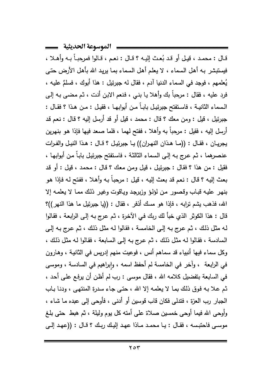 قال: محمد، قيل أو قد بُعث إليه؟ قال: نعم، قالوا فمرحبًا به وأهلا، فيستبشر به أهل السماء، لا يعلم أهل السماء بما يريد اللَّه بأهل الأرض حتى يُعلمهم، فوجد في السماء الدنيا آدم، فقال له جبرئيل: هذا أبوك، فسلمَّ عليه، فرد عليه، فقال: مرحبًا بك وأهلا يا بني، فنعم الابن أنت، ثم مضى به إلى السماء الثانية، فاستفتح جبرئيل بابًا من أبوابها، فقيل: من هذا؟ فقال: جبرئيل، قيل: ومن معك؟ قال: محمد، قيل أو قد أرسل إليه؟ قال: نعم قد أرسل إليه، فقيل: مرحبًا به وأهلا، ففتح لهما، فلما صعد فيها فإذا هو بنهرين يجريان، فقال: "ما هذان النهران" يا جبرئيل؟ قال: هذا النيل والفرات عنصرهما، ثم عرج به إلى السماء الثالثة، فاستفتح جبرئيل بابًا من أبوابها، فقيل: من هذا؟ فقال: جبرئيل، قيل ومن معك؟ قال: محمد، قيل: أو قد بعث إليه؟ قال: نعم قد بعث إليه، قيل: مرحبًا به وأهلا، ففتح له فإذا هو بنهر عليه قباب وقصور من لؤلؤ وزبرجد وياقوت وغير ذلك مما لا يعلمه إلا اللَّه، فذهب يشم ترابه، فإذا هو مسك أذفر، فقال: "يا جبرئيل ما هذا النهر"؟ قال: هذا الكوثر الذي خبأ لك ربك في الآخرة، ثم عرج به إلى الرابعة، فقالوا له مثل ذلك، ثم عرج به إلى الخامسة، فقالوا له مثل ذلك، ثم عرج به إلى السادسة، فقالوا له مثل ذلك، ثم عرج به إلى السابعة، فقالوا له مثل ذلك، وكل سماء فيها أنبياء قد سماهم أنس، فوعيت منهم إدريس في الثانية، وهارون في الرابعة، وآخر في الخامسة لم أحفظ اسمه، وإبراهيم في السادسة، وموسى في السابعة بتفضيل كلامه اللَّه، فقال موسى: رب لم أظن أن يرفع على أحد، ثم علا به فوق ذلك بما لا يعلمه إلا اللَّه، حتى جاء سدرة المنتهى، ودنا باب الجبار رب العزة، فتدلى فكان قاب قوسين أو أدنى، فأوحى إلى عبده ما شاء، وأوحى اللَّه فيما أوحى خمسين صلاة على أمته كل يوم وليلة، ثم هبط حتى بلغ موسى فاحتبسه، فقال: يا محمد ماذا عهد إليك ربك؟ قال: "عهد إلى