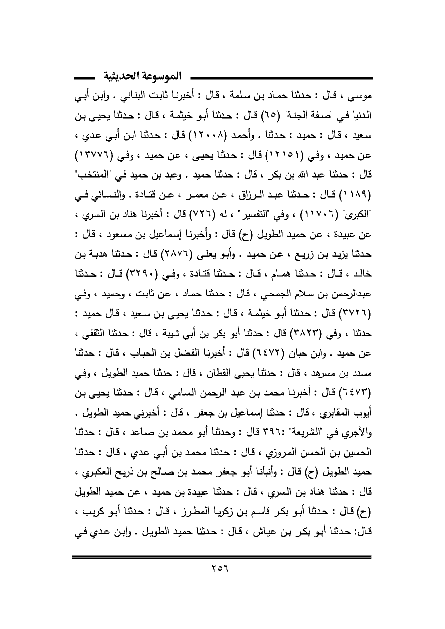 موسى، قال: حدثنا حماد بن سلمة، قال: أخبرنا ثابت البناني. وابن أبي الدنيا في "صفة الجنة" (٦٥) قال: حدثنا أبو خيثمة، قال: حدثنا يحيى بن سعيد، قال: حميد: حدثنا. وأحمد (١٢٠٠٨) قال: حدثنا ابن أبي عدي، عن حميد، وفي (١٢١٥١) قال: حدثنا يحيى، عن حميد، وفي (١٣٧٧٦) قال: حدثنا عبد اللَّه بن بكر، قال: حدثنا حميد. وعبد بن حميد في "المنتخب" (١١٨٩) قال: حدثنا عبد الرزاق، عن معمر، عن قتادة. والنسائي في "الكبرى" (١١٧٠٦)، وفي "التفسير"، له (٧٢٦) قال: أخبرنا هناد بن السري، عن عبيدة، عن حميد الطويل (ح) قال: وأخبرنا إسماعيل بن مسعود، قال: حدثنا يزيد بن زريع، عن حميد. وأبو يعلى (٢٨٧٦) قال: حدثنا هدبة بن خالد، قال: حدثنا همام، قال: حدثنا قتادة، وفي (٣٢٩٠) قال: حدثنا عبد الرحمن بن سلام الجمحي، قال: حدثنا حماد، عن ثابت، وحميد، وفي (٣٧٢٦) قال: حدثنا أبو خيثمة، قال: حدثنا يحيى بن سعيد، قال حميد: حدثنا، وفي (٣٨٢٣) قال: حدثنا أبو بكر بن أبي شيبة، قال: حدثنا الثقفي، عن حميد. وابن حبان (٦٤٧٢) قال: أخبرنا الفضل بن الحباب، قال: حدثنا مسدد بن مسرهد، قال: حدثنا يحيى القطان، قال: حدثنا حميد الطويل، وفي (٦٤٧٣) قال: أخبرنا محمد بن عبد الرحمن السامي، قال: حدثنا يحيى بن أيوب المقابري، قال: حدثنا إسماعيل بن جعفر، قال: أخبرني حميد الطويل. والآجري في "الشريعة": ٣٩٦ قال: وحدثنا أبو محمد بن صاعد، قال: حدثنا الحسين بن الحسن المروزي، قال: حدثنا محمد بن أبي عدي، قال: حدثنا حميد الطويل (ح) قال: وأنبأنا أبو جعفر محمد بن صالح بن ذريح العكبري، قال: حدثنا هناد بن السري، قال: حدثنا عبيدة بن حميد، عن حميد الطويل (ح) قال: حدثنا أبو بكر قاسم بن زكريا المطرز، قال: حدثنا أبو كريب، قال: حدثنا أبو بكر بن عياش، قال: حدثنا حميد الطويل. وابن عدي في