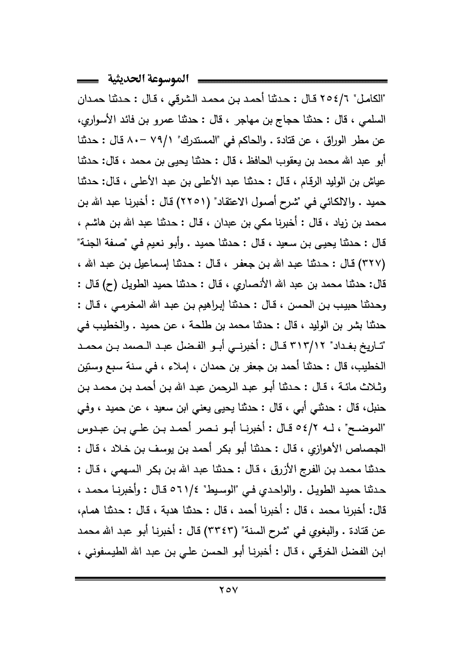 "الكامل" ٦/ ٢٥٤ قال: حدثنا أحمد بن محمد الشرقي، قال: حدثنا حمدان السلمي، قال: حدثنا حجاج بن مهاجر، قال: حدثنا عمرو بن فائد الأسواري، عن مطر الوراق، عن قتادة. والحاكم في "المستدرك" ١/ ٧٩ - ٨٠ قال: حدثنا أبو عبد اللَّه محمد بن يعقوب الحافظ، قال: حدثنا يحيى بن محمد، قال: حدثنا عياش بن الوليد الرقام، قال: حدثنا عبد الأعلى بن عبد الأعلى، قال: حدثنا حميد. والالكائي في "شرح أصول الاعتماد" (٢٢٥١) قال: أخبرنا عبد اللَّه بن محمد بن زياد، قال: أخبرنا مكي بن عبدان، قال: حدثنا عبد اللَّه بن هاشم، قال: حدثنا يحيى بن سعيد، قال: حدثنا حميد. وأبو نعيم في "صفة الجنة" (٣٢٧) قال: حدثنا عبد اللَّه بن جعفر، قال: حدثنا إسماعيل بن عبد اللَّه، قال: حدثنا محمد بن عبد اللَّه الأنصاري، قال: حدثنا حميد الطويل (ح) قال: وحدثنا حبيب بن الحسن، قال: حدثنا إبراهيم بن عبد اللَّه المخرمي، قال: حدثنا بشر بن الوليد، قال: حدثنا محمد بن طلحة، عن حميد. والخطيب في "تاريخ بغداد" ١٢/ ٣١٣ قال: أخبرني أبو الفضل عبد الصمد بن محمد الخطيب، قال: حدثنا أحمد بن جعفر بن حمدان، إملاء، في سنة سبع وستين وثلاث مائة، قال: حدثنا أبو عبد الرحمن عبد اللَّه بن أحمد بن محمد بن حنبل، قال: حدثني أبي، قال: حدثنا يحيى يعني ابن سعيد، عن حميد، وفي "الموضح"، له ٢/ ٥٤ قال: أخبرنا أبو نصر أحمد بن علي بن عبدوس الجصاص الأهوازي، قال: حدثنا أبو بكر أحمد بن يوسف بن خلاد، قال: حدثنا محمد بن الفرج الأزرق، قال: حدثنا عبد اللَّه بن بكر السهمي، قال: حدثنا حميد الطويل. والواحدي في "الوسيط" ٤/ ٥٦١ قال: وأخبرنا محمد، قال: أخبرنا محمد، قال: أخبرنا أحمد، قال: حدثنا هدبة، قال: حدثنا همام، عن قتادة. والبغوي في "شرح السنة" (٣٣٤٣) قال: أخبرنا أبو عبد اللَّه محمد ابن الفضل الخرقي، قال: أخبرنا أبو الحسن علي بن عبد اللَّه الطيسفوني،