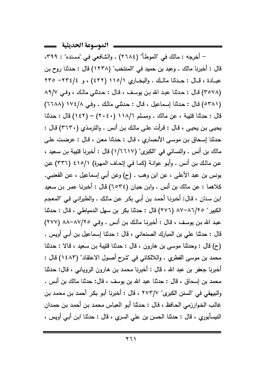 - أخرجه: مالك في "الموطأ" (٢٦٨٤). والشافعي في "مسنده": ٣٩٩، قال: أخبرنا مالك. وعبد بن حميد في "المنتخب" (١٢٣٨) قال: حدثنا روح بن عبادة، قال: حدثنا مالك. والبخاري ١/ ١١٥ (٤٢٢)، و ٤/ ٢٣٤ - ٢٣٥ (٣٥٧٨) قال: حدثنا عبد اللَّه بن يوسف، قال: حدثني مالك، وفي ٧/ ٨٩ (٥٣٨١) قال: حدثنا إسماعيل، قال: حدثني مالك. وفي ٨/ ١٧٤ (٦٦٨٨) قال: حدثنا قتيبة، عن مالك. ومسلم ٦/ ١١٨ (٢٠٤٠) - (١٤٢) قال: حدثنا يحيى بن يحيى، قال: قرأت على مالك بن أنس. والترمذي (٣٦٣٠) قال: حدثنا إسحاق بن موسى الأنصاري، قال: حدثنا معن، قال: عرضت على مالك بن أنس. والنسائي في "الكبرى" (١/ ٦٦١٧) قال: أخبرنا قتيبة بن سعيد، عن مالك بن أنس. وأبو عوانة (كما في إتحاف المهرة) ١/ ٤١٥ (٣٣٦) عن يونس بن عبد الأعلى، عن ابن وهب. (ح) وعن أبي إسماعيل، عن القعنبي. كلاهما: عن مالك بن أنس. وابن حبان (٦٥٣٤) قال: أخبرنا عمر بن سعيد ابن سنان، قال: أخبرنا أحمد بن أبي بكر عن مالك. والطبراني في "المعجم الكبير" ٢٥/ ٨٦ - ٨٧ (٢٧٦) قال: حدثنا بكر بن سهل الدمياطي، قال: حدثنا عبد اللَّه بن يوسف، قال: أخبرنا مالك بن أنس. وفي ٢٥/ ٨٧ - ٨٨ (٢٧٧) قال: حدثنا علي بن المبارك الصنعاني، قال: حدثنا إسماعيل بن أبي أويس. (ح) قال: وحدثنا موسى بن هارون، قال: حدثنا قتيبة بن سعيد، قالا: حدثنا محمد بن موسى الفطري. واللالكائي في "شرح أصول الاعتماد" (١٤٨٣) قال: أخبرنا جعفر بن عبد اللَّه، قال: أخبرنا محمد بن هارون الروياني، قال: حدثنا محمد بن إسحاق، قال: حدثنا عبد اللَّه بن يوسف، قال: حدثنا مالك بن أنس. والبيهقي في "السنن الكبرى" ٧/ ٢٧٣، قال: أخبرنا أبو بكر أحمد بن محمد بن غالب الخوارزمي الحافظ، قال: حدثنا أبو العباس محمد بن أحمد بن حمدان النيسابوري، قال: حدثنا الحسن بن علي السري، قال: حدثنا ابن أبي أويس،