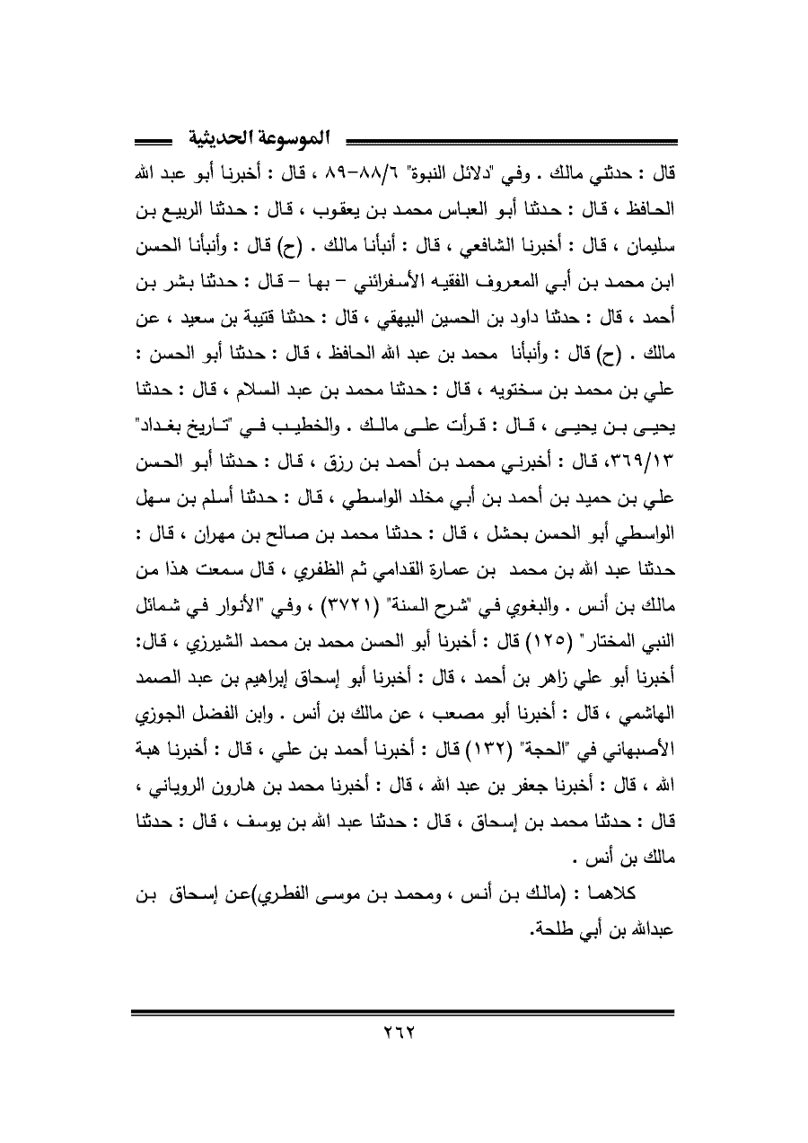 قال: حدثني مالك. وفي "دلائل النبوة" ٦/ ٨٨ - ٨٩، قال: أخبرنا أبو عبد اللَّه الحافظ، قال: حدثنا أبو العباس محمد بن يعقوب، قال: حدثنا الربيع بن سليمان، قال: أخبرنا الشافعي، قال: أنبأنا مالك. (ح) قال: وأنبأنا الحسن ابن محمد بن أبي المعروف الفقيه الأسفرائني -بها- قال: حدثنا بشر بن أحمد، قال: حدثنا داود بن الحسين البيهقي، قال: حدثنا قتيبة بن سعيد، عن مالك. (ح) قال: وأنبأنا محمد بن عبد اللَّه الحافظ، قال: حدثنا أبو الحسن: علي بن محمد بن سختويه، قال: حدثنا محمد بن عبد السلام، قال: حدثنا يحيى بن يحيى، قال: قرأت على مالك. والخطيب في "تاريخ بغداد" ١٣/ ٣٦٩، قال: أخبرني محمد بن أحمد بن رزق، قال: حدثنا أبو الحسن علي بن حميد بن أحمد بن أبي مخلد الواسطي، قال: حدثنا أسلم بن سهل الواسطي أبو الحسن بحشل، قال: حدثنا محمد بن صالح بن مهران، قال: حدثنا عبد اللَّه بن محمد بن عمارة القدامي ثم الظفري، قال سمعت هذا من مالك بن أنس. والبغوي في "شرح السنة" (٣٧٢١)، وفي "الأنوار في شمائل النبي المختار" (١٢٥) قال: أخبرنا أبو الحسن محمد بن محمد الشيرزي، قال: أخبرنا أبو علي زاهر بن أحمد، قال: أخبرنا أبو إسحاق إبراهيم بن عبد الصمد الهاشمي، قال: أخبرنا أبو مصعب، عن مالك بن أنس. وابن الفضل الجوزي الأصبهاني في "الحجة" (١٣٢) قال: أخبرنا أحمد بن علي، قال: أخبرنا هبة اللَّه، قال: أخبرنا جعفر بن عبد اللَّه، قال: أخبرنا محمد بن هارون الروياني، قال: حدثنا محمد بن إسحاق، قال: حدثنا عبد اللَّه بن يوسف، قال: حدثنا مالك بن أنس.