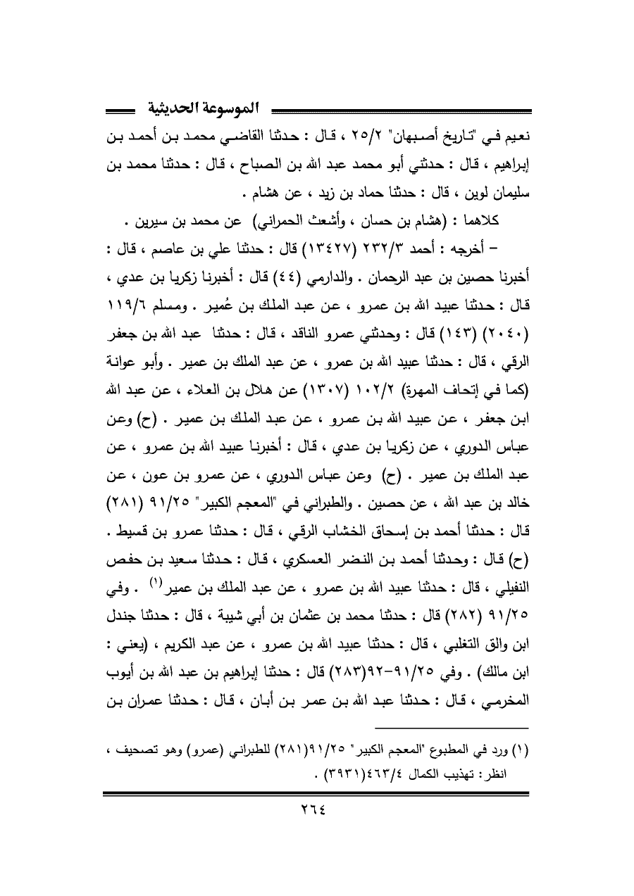(¬١) ورد في المطبوع "المعجم الكبير" ٢٥/ ٩١ (٢٨١) للطبراني (عمرو) وهو تصحيف، انظر: تهذيب الكمال ٢/ ٢٦٣ (٣٩٣١).
