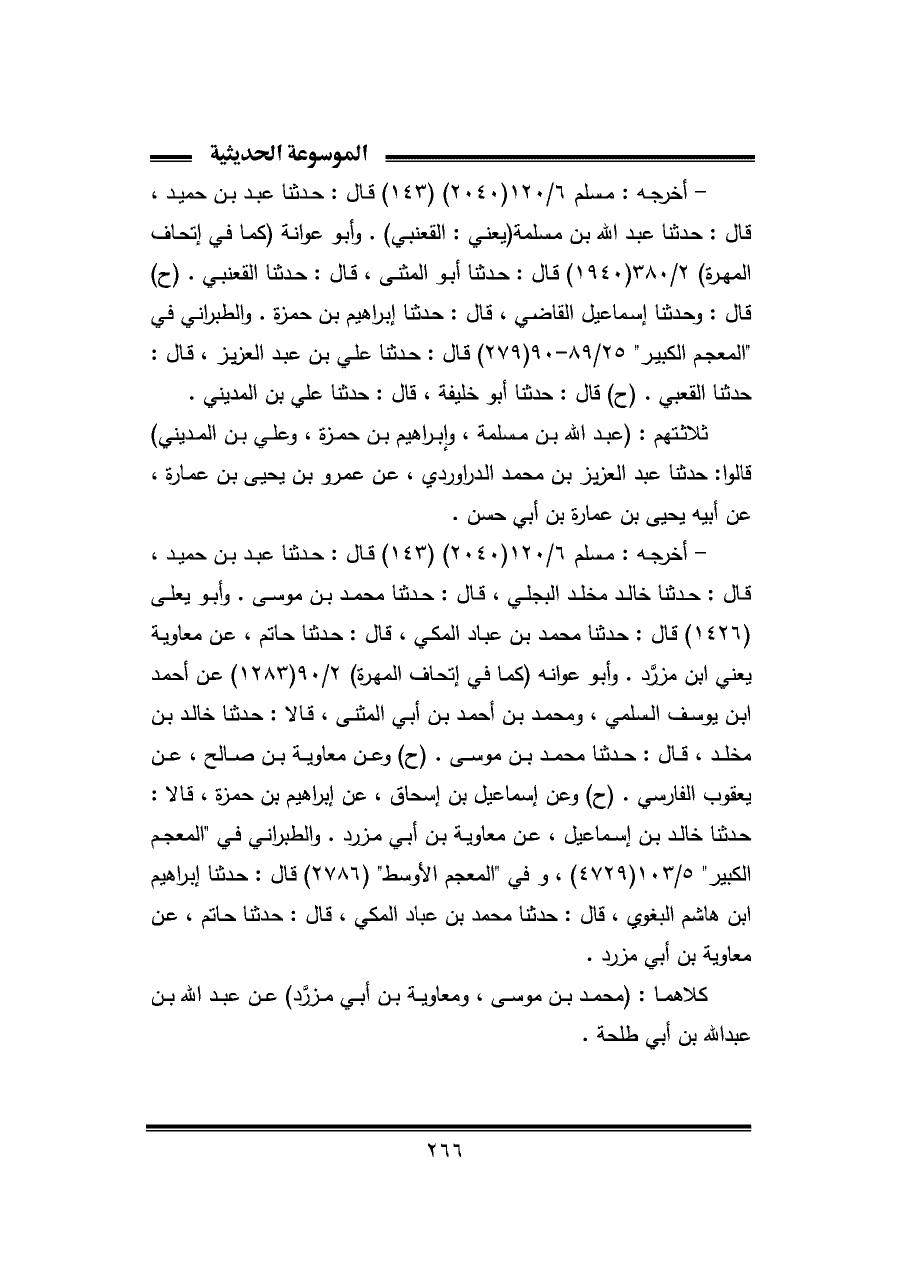 - أخرجه: مسلم ٦/ ١٢٠ (٢٠٤٠) (١٤٣) قال: حدثنا عبد بن حميد، قال: حدثنا خالد مخلد البجلي، قال: حدثنا محمد بن موسى. وأبو يعلى (١٤٢٦) قال: حدثنا محمد بن عباد المكي، قال: حدثنا حاتم، عن معاوية يعني ابن مزرَّد. وأبو عوانة (كما في إتحاف المهرة) ٢/ ٩٠ (١٢٨٣) عن أحمد ابن يوسف السلمي، ومحمد بن أحمد بن أبي المثنى، قالا: حدثنا خالد بن مخلد، قال: حدثنا محمد بن موسى. (ح) وعن معاوية بن صالح، عن يعقوب الفارسي. (ح) وعن إسماعيل بن إسحاق، عن إبراهيم بن حمزة، قالا: حدثنا خالد بن إسماعيل، عن معاوية بن أبي مزرد. والطبراني في "المعجم الكبير" ٥/ ١٠٣ (٤٧٢٩)، وفي "المعجم الأوسط" (٢٧٨٦) قال: حدثنا إبراهيم ابن هاشم البغوي، قال: حدثنا محمد بن عباد المكي، قال: حدثنا حاتم، عن معاوية بن أبي مزرد.