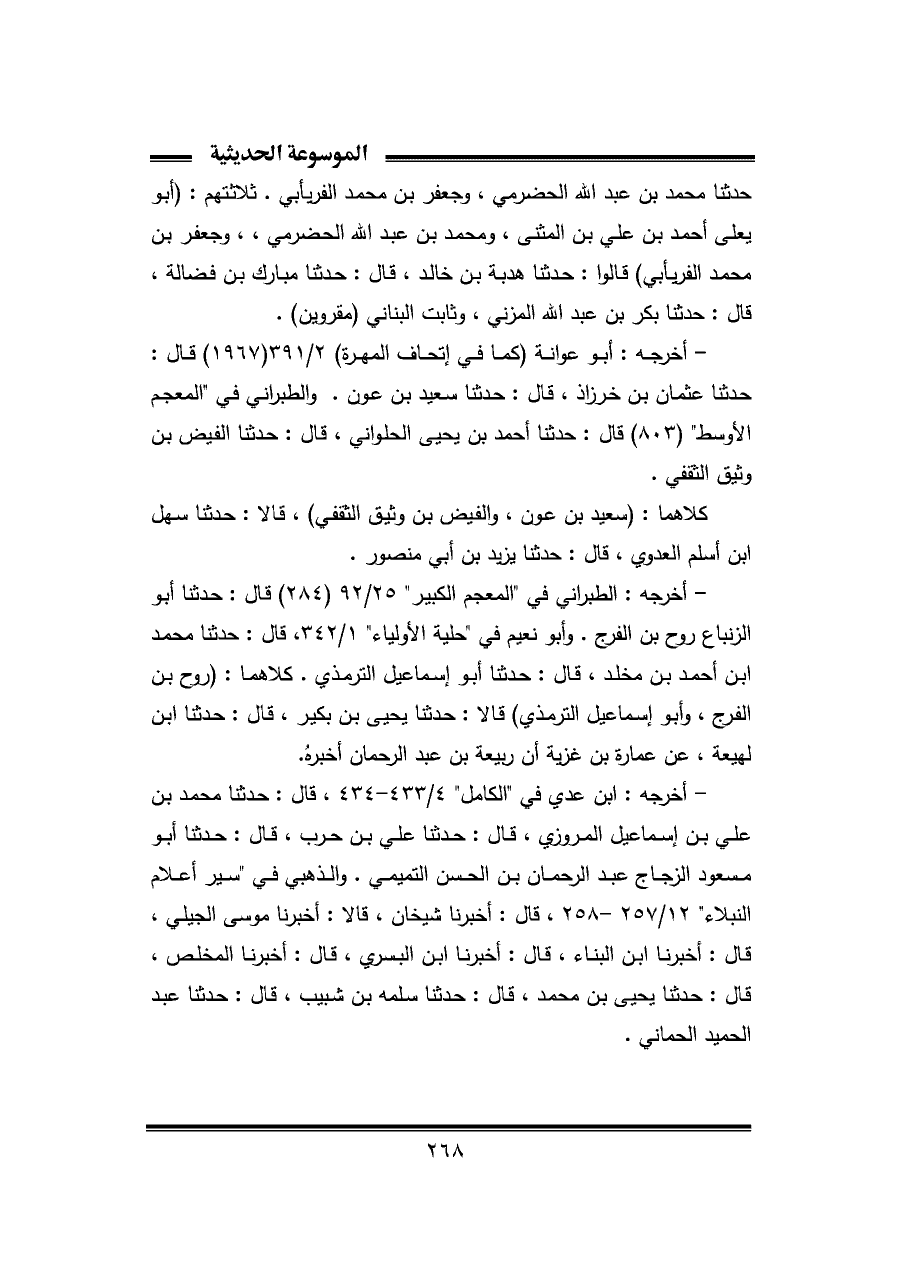 حدثنا محمد بن عبد اللَّه الحضرمي، وجعفر بن محمد الفريابي. ثلاثتهم: (أبو يعلى أحمد بن علي بن المثنى، ومحمد بن عبد اللَّه الحضرمي،، وجعفر بن محمد الفريابي) قالوا: حدثنا هدبة بن خالد، قال: حدثنا مبارك بن فضالة، قال: حدثنا بكر بن عبد اللَّه المزني، وثابت البناني (مقروين).