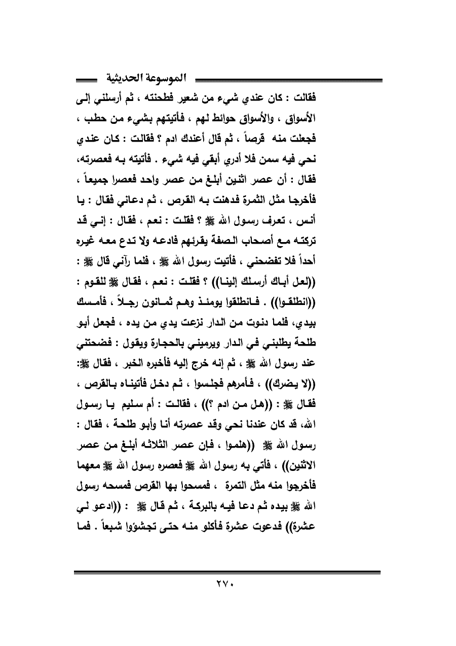 فقالت: كان عندي شيء من شعير فطحنته، ثم أرسلني إلى الأسواق، والأسواق حوائط لهم، فأتيتهم بشيء من حطب، فجعلت منه قرصًا، ثم قال أعندك ادم؟ فقالت: كان عندي نحي فيه سمن فلا أدري أبقي فيه شيء. فأتيته به فعصرته، فقال: أن عصر اثنين أبلغ من عصر واحد فعصرا جميعًا، فأخرجا مثل الثمرة فدهنت به القرص، ثم دعاني فقال: يا أنس، تعرف رسول اللَّه -صلى اللَّه عليه وسلم-؟ فقلت: نعم، فقال: إني قد تركته مع أصحاب الصفة يقرئهم فادعه ولا تدع معه غيره أحدًا فلا تفضحني، فأتيت رسول اللَّه -صلى اللَّه عليه وسلم-، فلما رآني قال -صلى اللَّه عليه وسلم-: "لعل أباك أرسلك إلينا"؟ فقلت: نعم، فقال -صلى اللَّه عليه وسلم- للقوم: "انطلقوا". فانطلقوا يومئذ وهم ثمانون رجلًا، فأمسك بيدي، فلما دنوت من الدار نزعت يدي من يده، فجعل أبو طلحة يطلبني في الدار ويرميني بالحجارة ويقول: فضحتني عند رسول اللَّه -صلى اللَّه عليه وسلم-، ثم إنه خرج إليه فأخبره الخبر، فقال -صلى اللَّه عليه وسلم-: "لا يضرك"، فأمرهم فجلسوا، ثم دخل فأتيناه بالقرص، فقال -صلى اللَّه عليه وسلم-: "هل من ادم؟ "، فقالت: أم سليم يا رسول اللَّه، قد كان عندنا نحي وقد عصرته أنا وأبو طلحة، فقال: رسول اللَّه -صلى اللَّه عليه وسلم- "هلموا، فإن عصر الثلاثه أبلغ من عصر الاثنين"، فأتي به رسول اللَّه -صلى اللَّه عليه وسلم- فعصره رسول اللَّه -صلى اللَّه عليه وسلم- معهما فأخرجوا منه مثل التمرة، فمسحوا بها القرص فمسحه رسول اللَّه -صلى اللَّه عليه وسلم- بيده ثم دعا فيه بالبركة، ثم قال -صلى اللَّه عليه وسلم-: "ادعو لي عشرة" فدعوت عشرة فأكلو منه حتى تجشؤوا شبعًا. فما