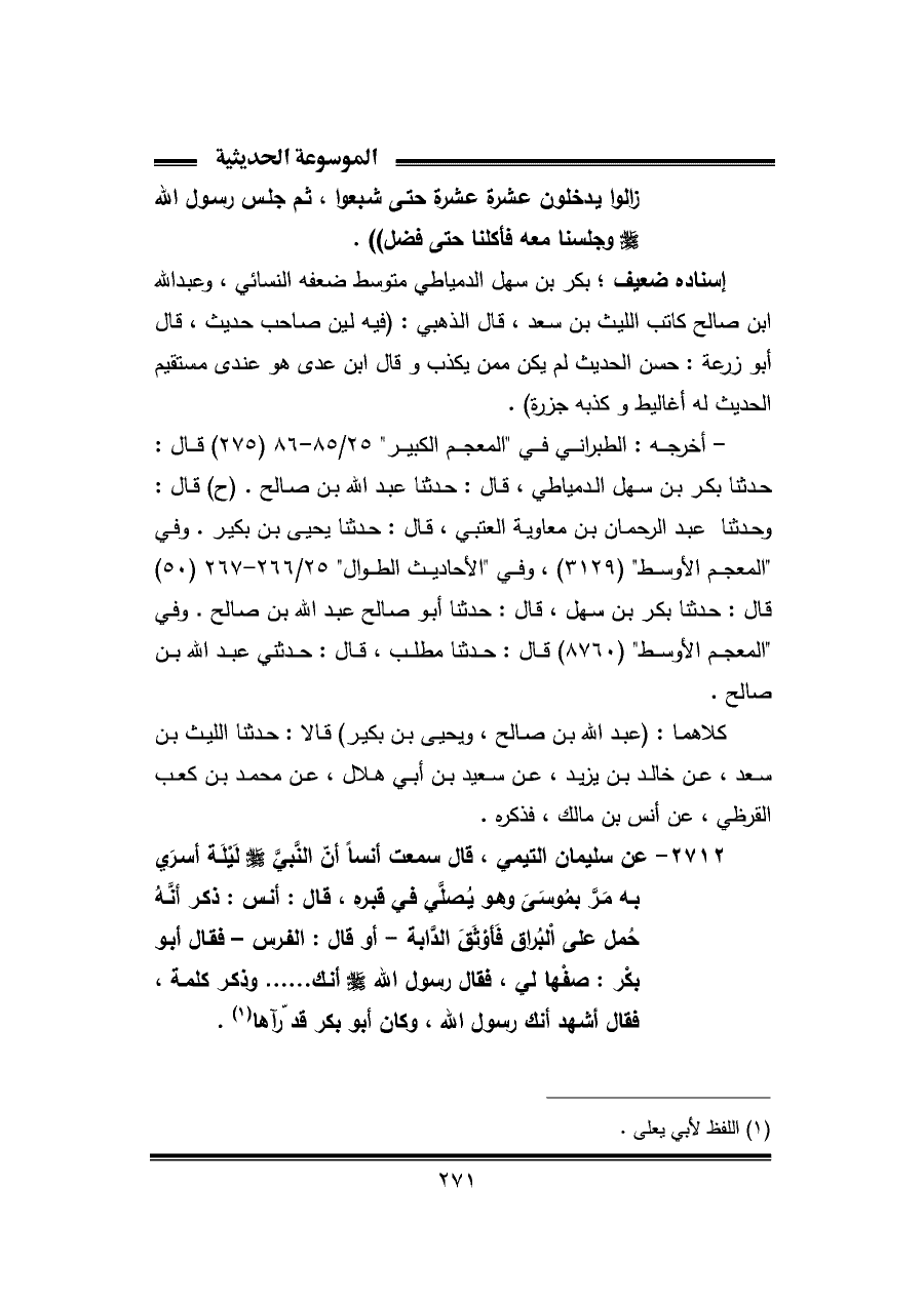 ٢٧١٢ - عن سليمان التيمي، قال سمعت أنسًا أنّ النَّبيَّ -صلى اللَّه عليه وسلم- لَيْلَة أسرَي به مَرَّ بمُوسَى وهو يُصلي في قبره، قال: أنس: ذكر أنَّهُ حُمل على البُراق فَأوْثَقَ الدَّابة -أو قال: الفرس- فقال أبو بكْر: صفْها لي، فقال رسول اللَّه -صلى اللَّه عليه وسلم- أنك. . . . . . وذكر كلمة، فقال أشهد أنك رسول اللَّه، وكان أبو بكر قد رآها (¬١).
