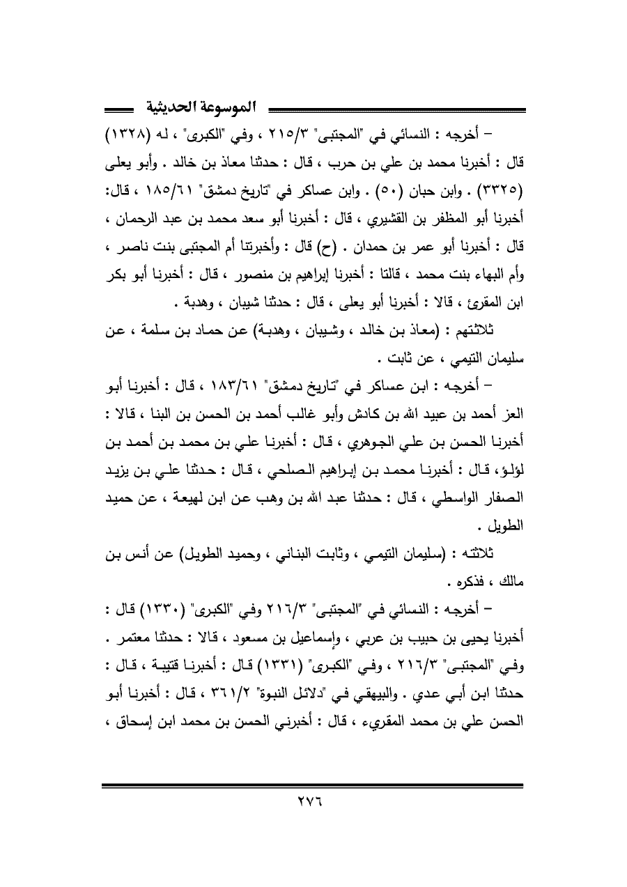 ثلاثتهم: (معاذ بن خالد، وشيبان، وهدبة) عن حماد بن سلمة، عن سليمان التيمي، عن ثابت.