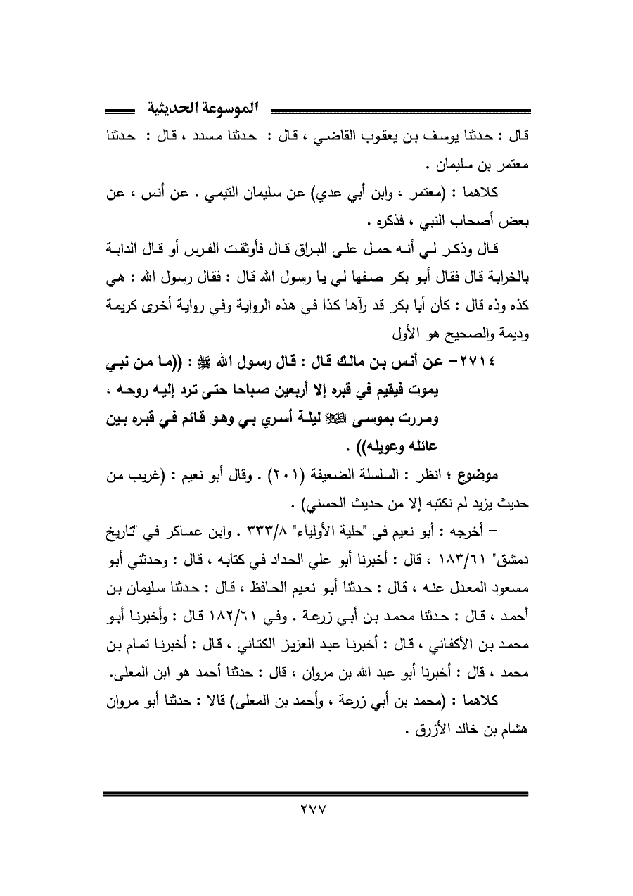 ٢٧١٤ - عن أنس بن مالك قال: قال رسول اللَّه -صلى اللَّه عليه وسلم-: "ما من نبي يموت فيقيم في قبره إلا أربعين صباحا حتى ترد إليه روحه، ومررت بموسى -عليه السلام- ليلة أسري بي وهو قائم في قبره بين عائله وعويله".