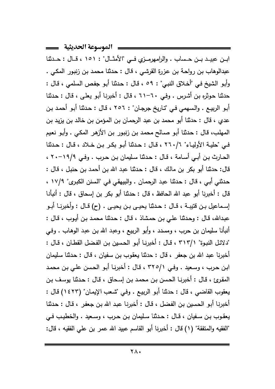 ابن عبيد بن حساب. والرامهرمزي في "الأمثال": ١٥١، قال: حدثنا عبد الوهاب بن رواحة بن عزرة القرشي، قال: حدثنا محمد بن زنبور المكي. وأبو الشيخ في "أخلاق النبي": ٥٩، قال: حدثنا أبو جفص السلمي، قال: حدثنا حوثره بن أشرس. وفي ٦٠ - ٦١، قال: أخبرنا أبو يعلى، قال: حدثنا أبو الربيع. والسهمي في "تاريخ جرجان": ٢٥٦، قال: حدثنا أبو أحمد بن عدي، قال: حدثنا أبو محمد بن عبد الرحمان بن المؤمن بن خالد بن يزيد بن المهلب، قال: حدثنا أبو صالح محمد بن زنبور بن الأزهر المكي. وأبو نعيم في "حلية الأولياء" ٦/ ٢٦٠، قال: حدثنا أبو بكر بن خلاد، قال: حدثنا الحارث بن أبي أسامة، قال: حدثنا سليمان بن حرب. وفي ٩/ ١٩ - ٢٠، قال: حدثنا أبو بكر بن مالك، قال: حدثنا عبد اللَّه بن أحمد بن حنبل، قال: حدثني أبي، قال: حدثنا عبد الرحمان. والبيهقي في "السنن الكبرى" ٩/ ١٧، قال: أخبرنا أبو عبد اللَّه الحافظ، قال: حدثنا أبو بكر بن إسحاق، قال: أنبأنا إسماعيل بن قتيبة، قال: حدثنا يحيى بن يحيى. (ح) قال: وأخبرنا أبو عبد اللَّه، قال: وحدثنا علي بن حمشاذ، قال: حدثنا محمد بن أيوب، قال: أنبأنا سليمان بن حرب، ومسدد، وأبو الربيع، وعبد اللَّه بن عبد الوهاب. وفي "دلائل النبوة" ١/ ٣١٣، قال: أخبرنا أبو الحسين بن الفضل القطان، قال: أخبرنا عبد اللَّه بن جعفر، قال: حدثنا يعقوب بن سفيان، قال: حدثنا سليمان ابن حرب، وسعيد. وفي ١/ ٣٢٥، قال: أخبرنا أبو الحسن علي بن محمد المقرئ، قال: أخبرنا الحسن بن محمد بن إسحاق، قال: حدثنا يوسف بن يعقوب القاضي، قال: حدثنا أبو الربيع. وفي "شعب الإيمان" (١٤٢٣) قال: أخبرنا أبو الحسين بن الفضل، قال: أخبرنا عبد اللَّه بن جعفر، قال: حدثنا يعقوب بن سفيان، قال: حدثنا سليمان بن حرب، وسعيد. والخطيب في "الفقيه والمتفقة" (١) قال: أخبرنا أبو القاسم عبيد اللَّه عمر بن علي الفقيه، قال: