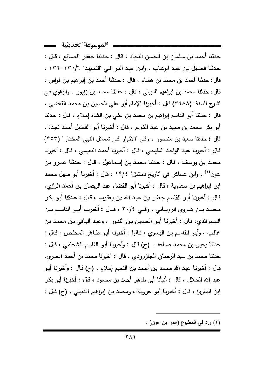حدثنا أحمد بن سلمان بن الحسن النجاد، قال: حدثنا جعفر الصائغ، قال: حدثنا فضيل بن عبد الوهاب. وابن عبد البر في "التمهيد" ٦/ ١٣٥ - ١٣٦، قال: حدثنا أحمد بن محمد بن هشام، قال: حدثنا أحمد بن إبراهيم بن فراس، قال: حدثنا محمد بن إبراهيم الدبيلي، قال: حدثنا محمد بن زنبور. والبغوي في "شرح السنة" (٣٦٨٨) قال: أخبرنا الإمام أبو علي الحسين بن محمد القاضي، قال: حدثنا أبو القاسم إبراهيم بن محمد بن علي بن الشاه إملاء، قال: حدثنا أبو بكر محمد بن مجيد بن عبد الكريم، قال: أخبرنا أبو الفضل أحمد نجدة، قال: حدثنا سعيد بن منصور. وفي "الأنوار في شمائل النبي المختار" (٣٥٣) قال: أخبرنا عبد الواحد المليحي، قال: أخبرنا أحمد النعيمي، قال: أخبرنا محمد بن يوسف، قال: حدثنا محمد بن إسماعيل، قال: حدثنا عمرو بن عون (¬١). وابن عساكر في "تاريخ دمشق" ٤/ ١٩، قال: أخبرنا أبو سهل محمد ابن إبراهيم بن سعدوية، قال: أخبرنا أبو الفضل عبد الرحمان بن أحمد الرازي، قال: أخبرنا أبو القاسم جعفر بن عبد اللَّه بن يعقوب، قال: حدثنا أبو بكر محمد بن هروي الروياني. وفي ٤/ ٢٠، قال: أخبرنا أبو القاسم بن السمرقندي، قال: أخبرنا أبو الحسين بن النقور، وعبد الباقي بن محمد بن غالب، وأبو القاسم بن البسري، قالوا: أخبرنا أبو طاهر المخلص، قال: حدثنا يحيى بن محمد صاعد. (ح) قال: وأخبرنا أبو القاسم الشحامي، قال: حدثنا محمد بن عبد الرحمان الجنزرودي، قال: أخبرنا محمد بن أحمد الحيري، قال: أخبرنا عبد اللَّه محمد بن أحمد بن النعيم إملاءٍ. (ح) قال: وأخبرنا أبو عبد اللَّه الخلال، قال: أنبأنا أبو طاهر أحمد بن محمود، قال: أخبرنا أبو بكر ابن المقرئ، قال: أخبرنا أبو عروبة، ومحمد بن إبراهيم الديبلي. (ح) قال: