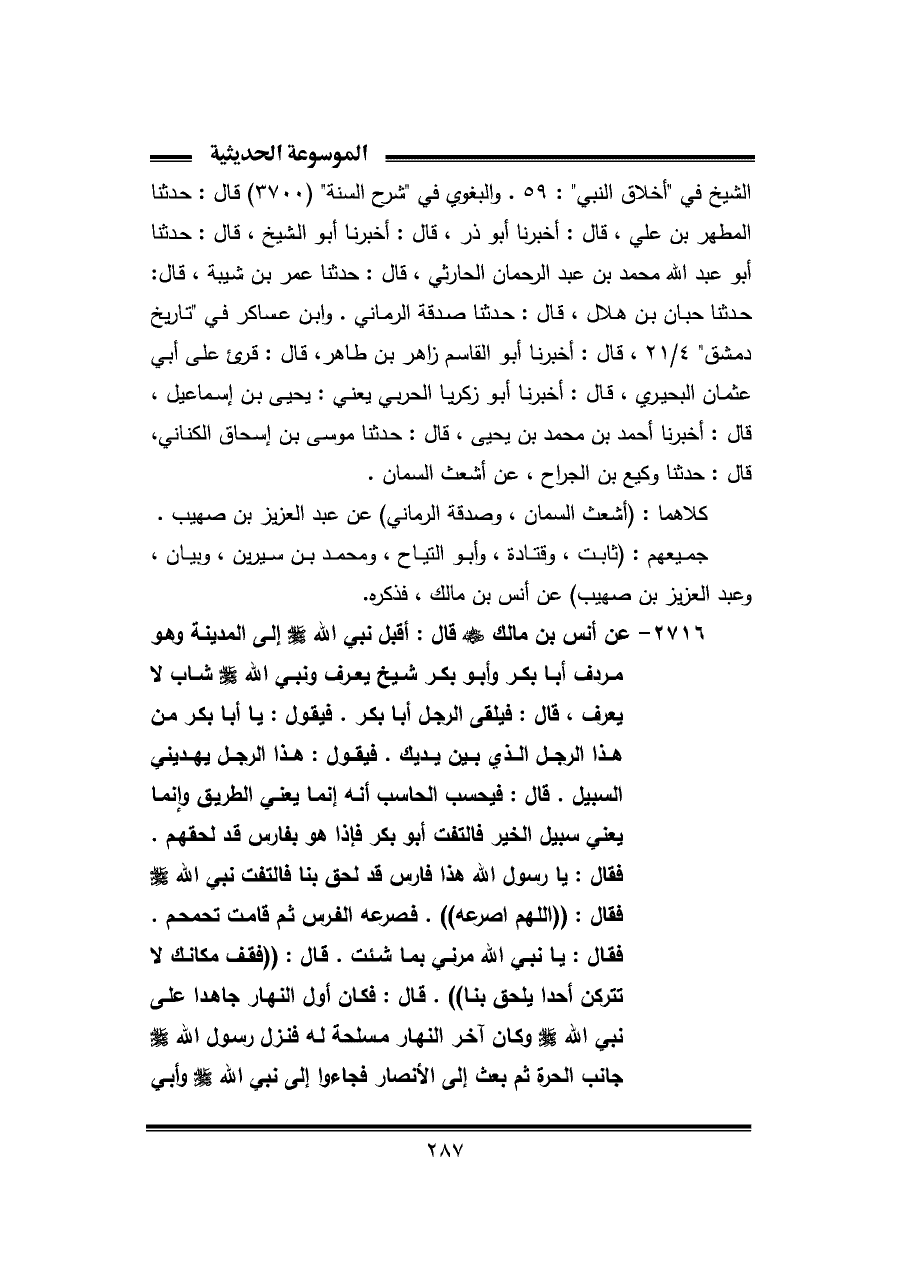 ٢٧١٦ - عن أنس بن مالك -رضي اللَّه عنه- قال: أقبل نبي اللَّه -صلى اللَّه عليه وسلم- إلى المدينة وهو مردف أبا بكر وأبو بكر شيخ يعرف ونبي اللَّه -صلى اللَّه عليه وسلم- شاب لا يعرف، قال: فيلقى الرجل أبا بكر. فيقول: يا أبا بكر من هذا الرجل الذي بين يديك. فيقول: هذا الرجل يهديني السبيل. قال: فيحسب الحاسب أنه إنما يعني الطريق وإنما يعني سبيل الخير فالتفت أبو بكر فإذا هو بفارس قد لحقهم. فقال: يا رسول اللَّه هذا فارس قد لحق بنا فالتفت نبي اللَّه -صلى اللَّه عليه وسلم- فقال: "اللهم اصرعه". فصرعه الفرس ثم قامت تحمحم. فقال: يا نبي اللَّه مرني بما شئت. قال: "فقف مكانك لا تتركن أحدا يلحق بنا". قال: فكان أول النهار جاهدا على نبي اللَّه -صلى اللَّه عليه وسلم- وكان آخر النهار مسلحة له فنزل رسول اللَّه -صلى اللَّه عليه وسلم- جانب الحرة ثم بعث إلى الأنصار فجاءوا إلى نبي اللَّه -صلى اللَّه عليه وسلم- وأبي