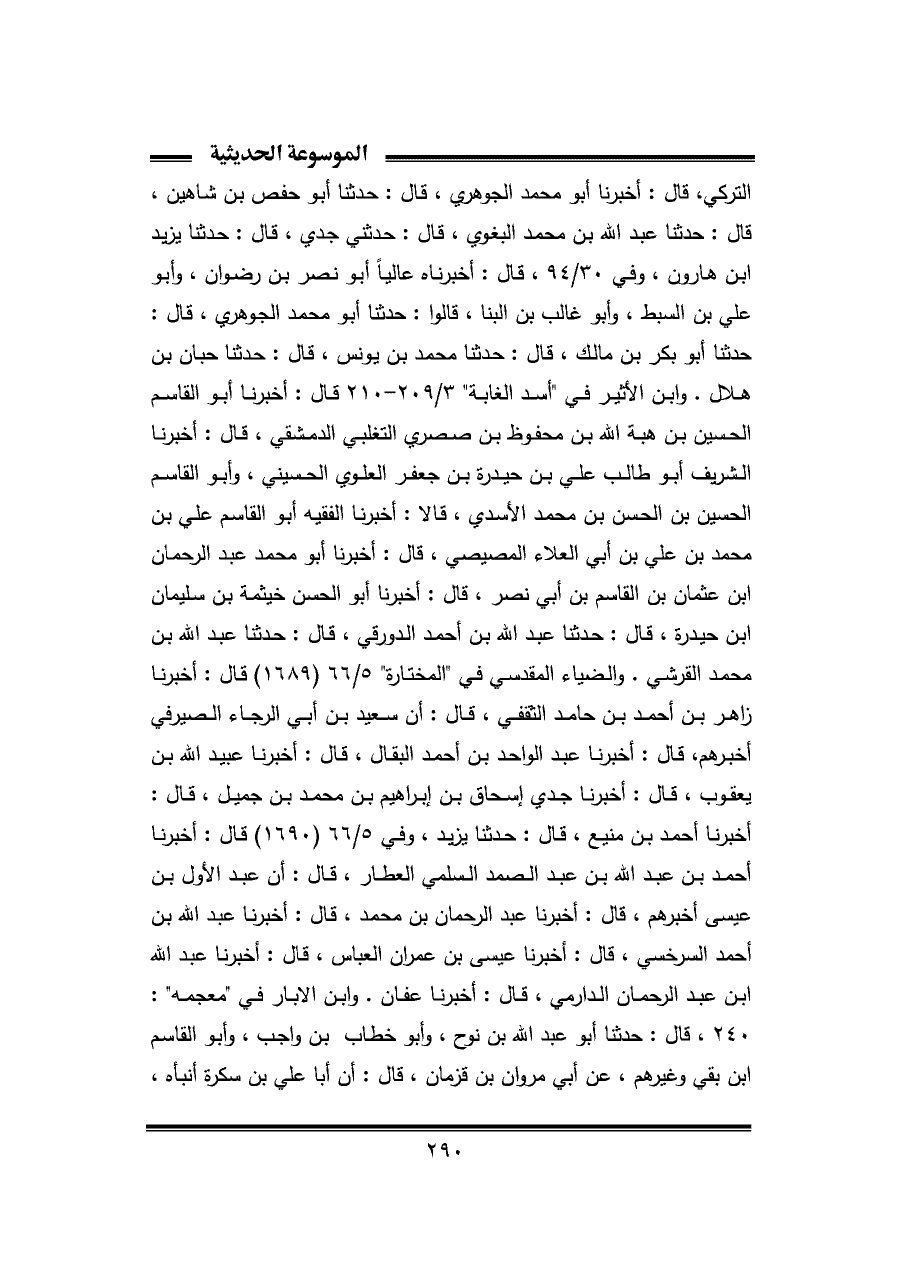 التركي، قال: أخبرنا أبو محمد الجوهري، قال: حدثنا أبو حفص بن شاهين، قال: حدثنا عبد اللَّه بن محمد البغوي، قال: حدثني جدي، قال: حدثنا يزيد ابن هارون، وفي ٣٠/ ٩٤، قال: أخبرناه عاليًا أبو نصر بن رضوان، وأبو علي بن السبط، وأبو غالب بن البنا، قالوا: حدثنا أبو محمد الجوهري، قال: حدثنا أبو بكر بن مالك، قال: حدثنا محمد بن يونس، قال: حدثنا حبان بن هلال. وابن الأثير في "أسد الغابة" ٣/ ٢٠٩ - ٢١٠ قال: أخبرنا أبو القاسم الحسين بن هبة اللَّه بن محفوظ بن صصري التغلبي الدمشقي، قال: أخبرنا الشريف أبو طالب علي بن حيدرة بن جعفر العلوي الحسيني، وأبو القاسم الحسين بن الحسن بن محمد الأسدي، قالا: أخبرنا الفقيه أبو القاسم علي بن محمد بن علي بن أبي العلاء المصيصي، قال: أخبرنا أبو محمد عبد الرحمان ابن عثمان بن القاسم بن أبي نصر، قال: أخبرنا أبو الحسن خيثمة بن سليمان ابن حيدرة، قال: حدثنا عبد اللَّه بن أحمد الدورقي، قال: حدثنا عبد اللَّه بن محمد القرشي. والضياء المقدسي في "المختارة" ٥/ ٦٦ (١٦٨٩) قال: أخبرنا زاهر بن أحمد بن حامد الثقفي، قال: أن سعيد بن أبي الرجاء الصيرفي أخبرهم، قال: أخبرنا عبد الواحد بن أحمد البقال، قال: أخبرنا عبيد اللَّه بن يعقوب، قال: أخبرنا جدي إسحاق بن إبراهيم بن محمد بن جميل، قال: أخبرنا أحمد بن منيع، قال: حدثنا يزيد، وفي ٥/ ٦٦ (١٦٩٠) قال: أخبرنا أحمد بن عبد اللَّه بن عبد الصمد السلمي العطار، قال: أن عبد الأول بن عيسى أخبرهم، قال: أخبرنا عبد الرحمان بن محمد، قال: أخبرنا عبد اللَّه بن أحمد السرخسي، قال: أخبرنا عيسى بن عمران العباس، قال: أخبرنا عبد اللَّه ابن عبد الرحمان الدارمي، قال: أخبرنا عفان. وابن الابار في "معجمه": ٢٤٠، قال: حدثنا أبو عبد اللَّه بن نوح، وأبو خطاب بن واجب، وأبو القاسم ابن بقي وغيرهم، عن أبي مروان بن قزمان، قال: أن أبا علي بن سكرة أنبأه،