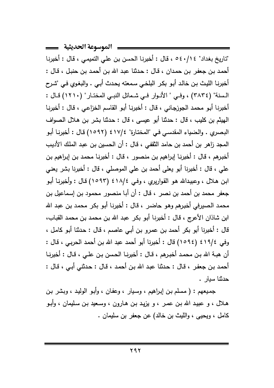 جميعهم: (مسلم بن إبراهيم، وسيار، وعفان، وأبو الوليد، وبشر بن هلال، وعبيد اللَّه بن عمر، ويزيد بن هارون، وسعيد بن سليمان، وأبو كامل، ويحيى، والليث بن خالد) عن جعفر بن سليمان.