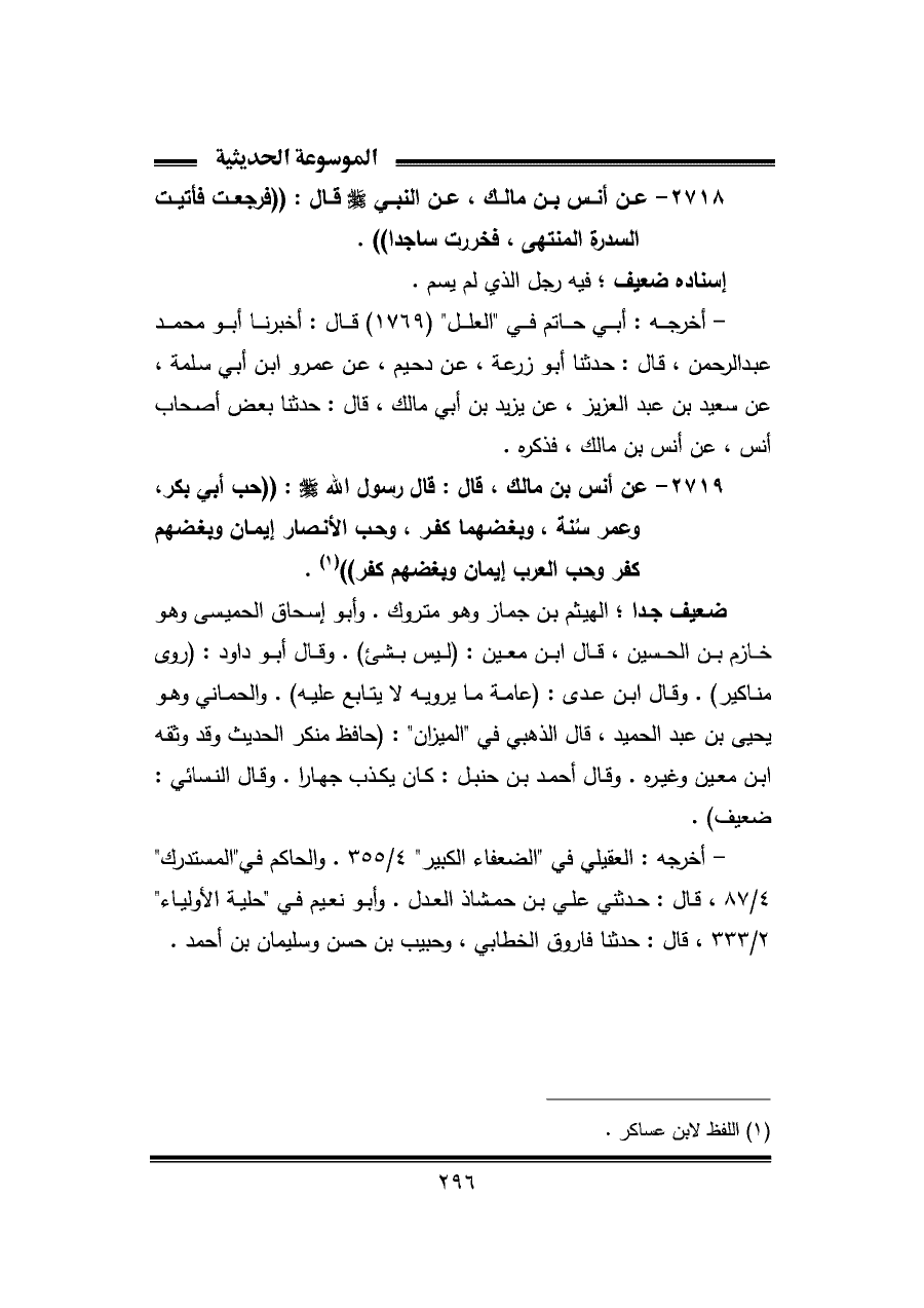 ٢٧١٩ - عن أنس بن مالك، قال: قال رسول اللَّه -صلى اللَّه عليه وسلم-: "حب أبي بكر، وعمر سُنة، وبغضهما كفر، وحب الأنصار إيمان وبغضهم كفر وحب العرب إيمان وبغضهم كفر" (¬١).