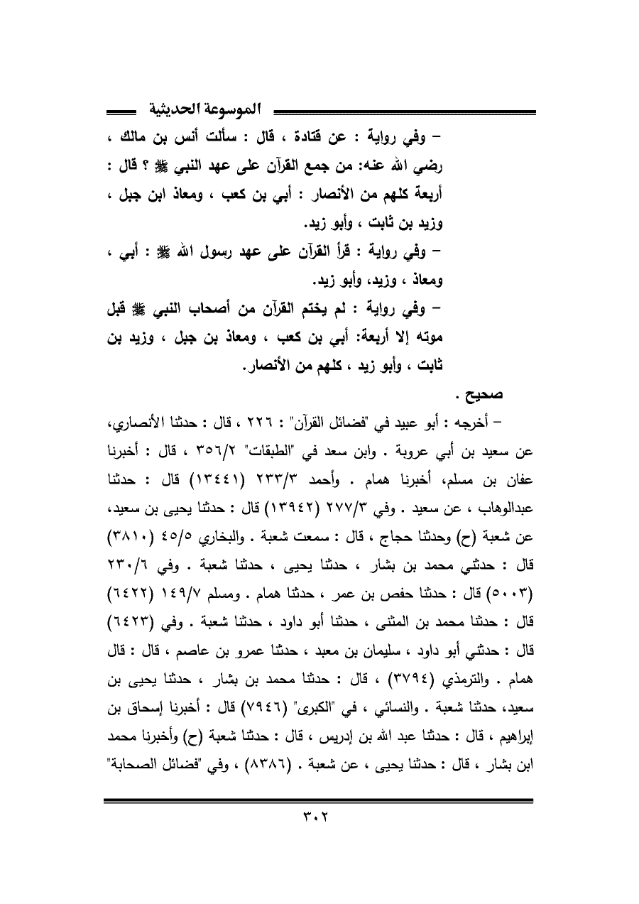 - وفي رواية: لم يختم القرآن من أصحاب النبي -صلى اللَّه عليه وسلم- قبل موته إلا أربعة: أبي بن كعب، ومعاذ بن جبل، وزيد بن ثابت، وأبو زيد، كلهم من الأنصار.