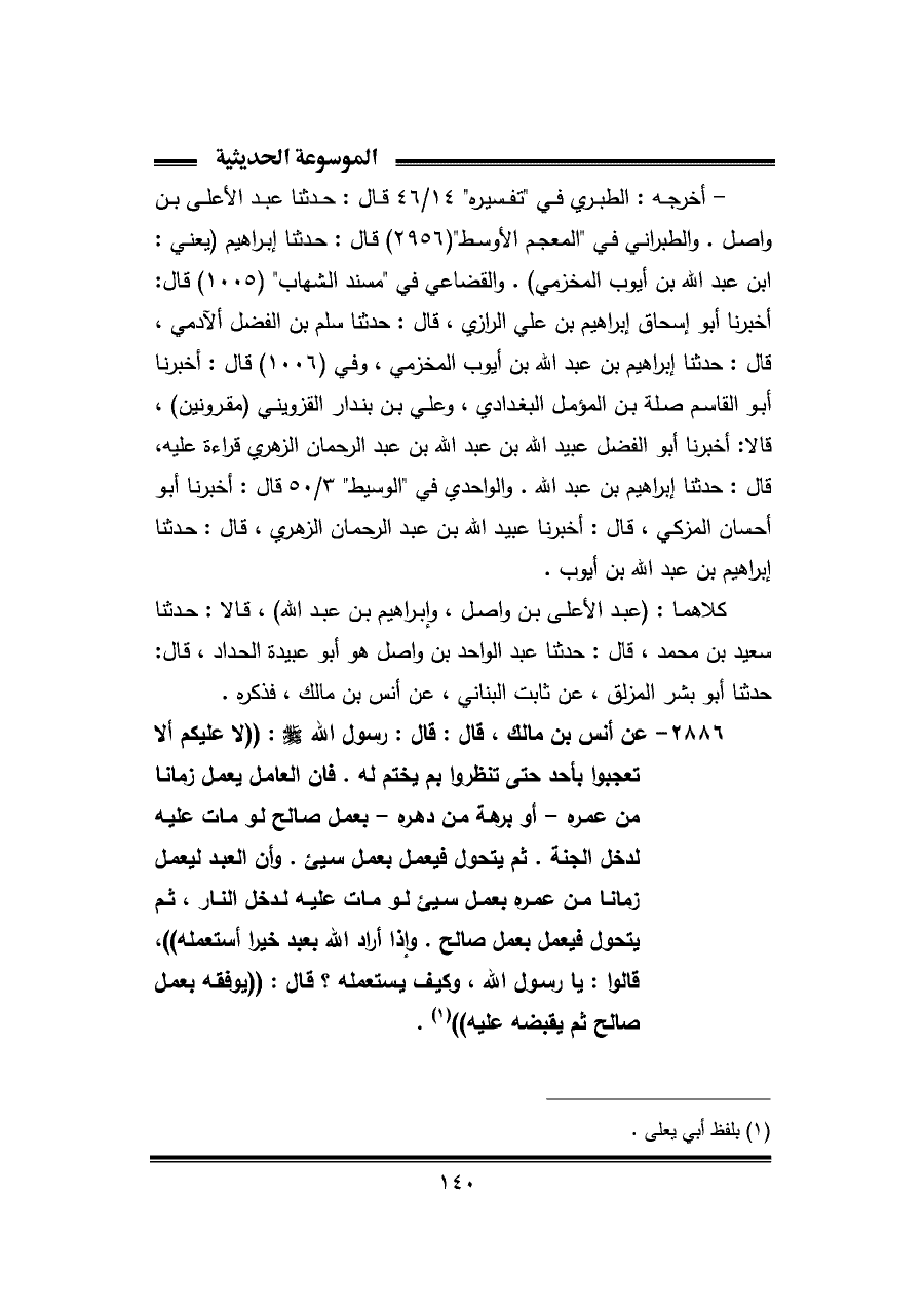 ٢٨٨٦ - عن أنس بن مالك، قال: قال: رسول الله - صلى الله عليه وسلم -: "لا عليكم ألا تعجبوا بأحد حتى تنظروا بم يختم له. فإن العامل يعمل زمانا من عمره -أو برهة من دهره- بعمل صالح لو مات عليه لدخل الجنة. ثم يتحول فيعمل بعمل سيئ. وأن العبد ليعمل زمانا من عمره بعمل سيئ لو مات عليه لدخل النار، ثم يتحول فيعمل بعمل صالح. وإذا أراد الله بعبد خيرا استعمله"، قالوا: يا رسول الله، وكيف يستعمله؟ قال: "يوفقه بعمل صالح ثم يقبضه عليه" (¬١).