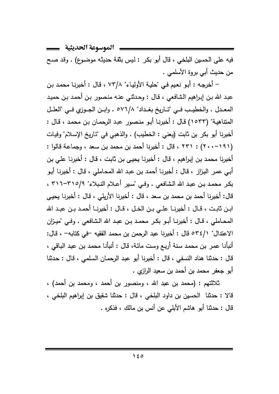 ثلاثتهم: (محمد بن عبد الله، ومنصور بن أحمد، ومحمد بن أحمد)، قالا: حدثنا الحسين بن داود البلخي، قال: حدثنا شقيق بن إبراهيم البلخي، قال: حدثنا أبو هاشم الأبلي عن أنس بن مالك، فذكره.