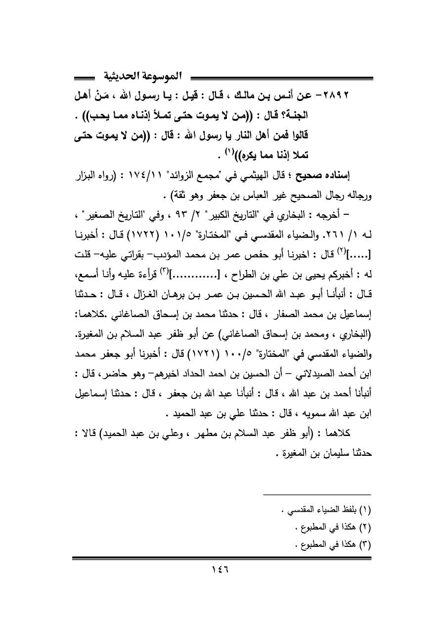 ٢٨٩٢ - عن أنس بن مالك، قال: قيل: يا رسول الله، مَنْ أهل الجنة؟ قال: "من لا يموت حتى تملأ إذناه مما يحب". قالوا فمن أهل النار يا رسول الله: قال: "من لا يموت حتى تملا إذنا مما يكره" (¬١).