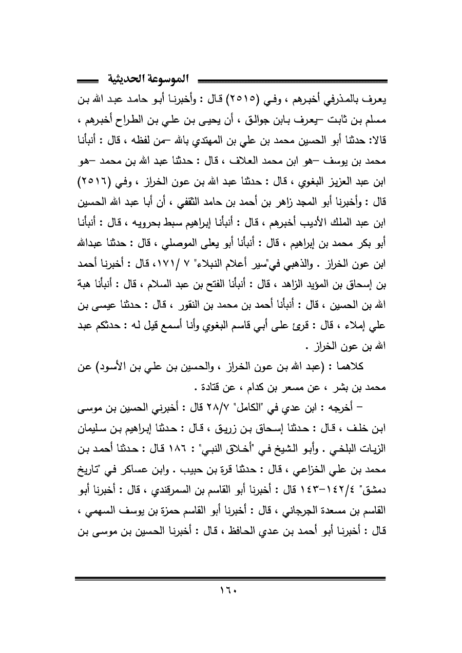 يعرف بالمذرفي أخبرهم، وفي (٢٥١٥) قال: وأخبرنا أبو حامد عبد الله بن مسلم بن ثابت -يعرف بابن جوالق، أن يحيى بن علي بن الطراح أخبرهم، قالا: حدثنا أبو الحسين محمد بن علي بن المهتدي بالله- من لفظه، قال: أنبأنا محمد بن يوسف -هو ابن محمد العلاف، قال: حدثنا عبد الله بن محمد- هو ابن عبد العزيز البغوي، قال: حدثنا عبد الله بن عون الخراز، وفي (٢٥١٦) قال: وأخبرنا أبو المجد زاهر بن أحمد بن حامد الثقفي، أن أبا عبد الله الحسين ابن عبد الملك الأديب أخبرهم، قال: أنبأنا إبراهيم سبط بحرويه، قال: أنبأنا أبو بكر محمد بن إبراهيم، قال: أنبأنا أبو يعلى الموصلي، قال: حدثنا عبد الله ابن عون الخراز. والذهبي في "سير أعلام النبلاء" ٧/ ١٧١، قال: أخبرنا أحمد بن إسحاق بن المؤيد الزاهد، قال: أنبأنا الفتح بن عبد السلام، قال: أنبأنا هبة الله بن الحسين، قال: أنبأنا أحمد بن محمد بن النقور، قال: حدثنا عيسى بن علي إملاء، قال: قرئ على أبي قاسم البغوي وأنا أسمع قيل له: حدثكم عبد الله بن عون الخراز.