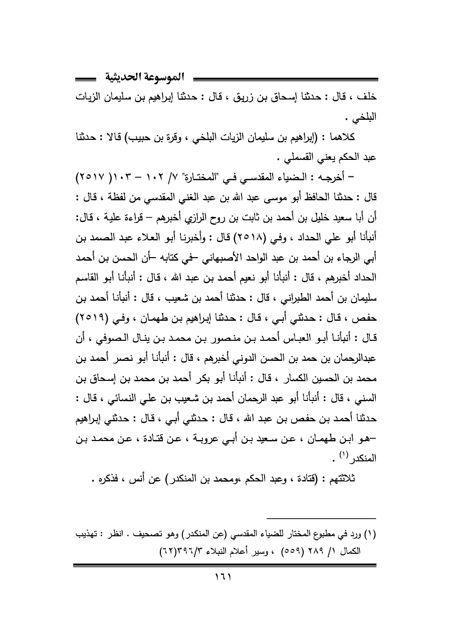(¬١) ورد في مطبوع المختار للضياء المقدسي (عن المنكدر) وهو تصحيف. انظر: تهذيب الكمال ١/ ٢٨٩ (٥٥٩)، وسير أعلام النبلاء ٣/ ٣٩٦ (٦٢).