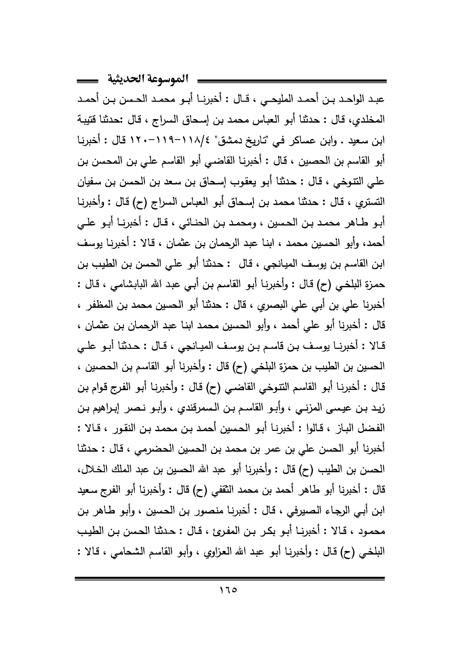 عبد الواحد بن أحمد المليحي، قال: أخبرنا أبو محمد الحسن بن أحمد المخلدي، قال: حدثنا أبو العباس محمد بن إسحاق السراج، قال: حدثنا قتيبة ابن سعيد. وابن عساكر في "تاريخ دمشق" ٤/ ١١٨ - ١١٩ - ١٢٠ قال: أخبرنا أبو القاسم بن الحصين، قال: أخبرنا القاضي أبو القاسم علي بن المحسن بن علي التنوخي، قال: حدثنا أبو يعقوب إسحاق بن سعد بن الحسن بن سفيان التستري، قال: حدثنا محمد بن إسحاق أبو العباس السراج (ح) قال: وأخبرنا أبو طاهر محمد بن الحسين، ومحمد بن الحنائي، قال: أخبرنا أبو علي أحمد، وأبو الحسين محمد، ابنا عبد الرحمان بن عثمان، قالا: أخبرنا يوسف ابن القاسم بن يوسف الميانجي، قال: حدثنا أبو علي الحسن بن الطيب بن حمزة البلخي (ح) قال: وأخبرنا أبو القاسم بن أبي عبد الله البابشامي، قال: أخبرنا علي بن أبي علي البصري، قال: حدثنا أبو الحسين محمد بن المظفر، قال: أخبرنا أبو علي أحمد، وأبو الحسين محمد ابنا عبد الرحمان بن عثمان، قالا: أخبرنا يوسف بن قاسم بن يوسف الميانجي، قال: حدثنا أبو علي الحسين بن الطيب بن حمزة البلخي (ح) قال: وأخبرنا أبو القاسم بن الحصين، قال: أخبرنا أبو القاسم التنوخي القاضي (ح) قال: وأخبرنا أبو الفرج قوام بن زيد بن عيسى المزني، وأبو القاسم بن السمرقندي، وأبو نصر إبراهيم بن الفضل الباز، قالوا: أخبرنا أبو الحسين أحمد بن محمد بن النقور، قالا: أخبرنا أبو الحسن علي بن عمر بن محمد بن الحسين الحضرمي، قال: حدثنا الحسن بن الطيب (ح) قال: وأخبرنا أبو عبد الله الحسين بن عبد الملك الخلال، قال: أخبرنا أبو طاهر أحمد بن محمد الثقفي (ح) قال: وأخبرنا أبو الفرج سعيد ابن أبي الرجاء الصيرفي، قال: أخبرنا منصور بن الحسين، وأبو طاهر بن محمود، قالا: أخبرنا أبو بكر بن المقرئ، قال: حدثنا الحسن بن الطيب البلخي (ح) قال: وأخبرنا أبو عبد الله العزاوي، وأبو القاسم الشحامي، قالا: