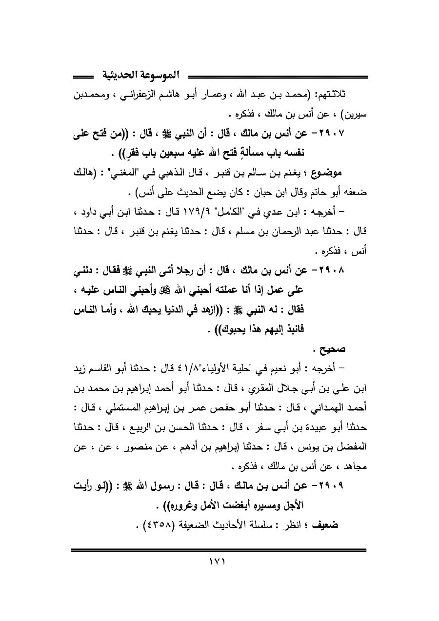٢٩٠٧ - عن أنس بن مالك، قال: أن النبي - صلى الله عليه وسلم -، قال: "من فتح على نفسه باب مسألةٍ فتح الله عليه سبعين باب فقر".