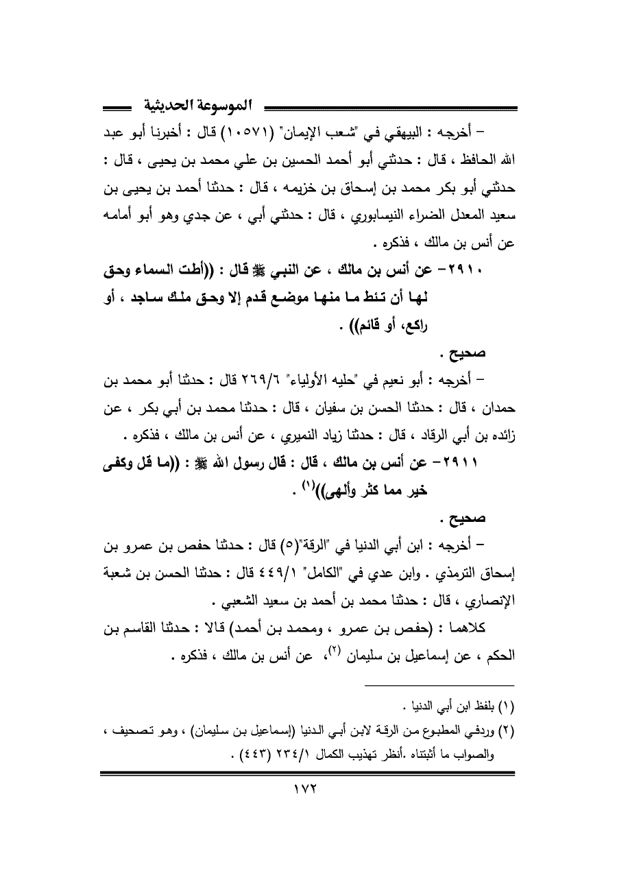 (¬٢) ورد في المطبوع من الرقة لابن أبي الدنيا (إسماعيل بن سليمان)، وهو تصحيف، والصواب ما أثبتناه. انظر تهذيب الكمال ١/ ٢٣٤ (٤٤٣).