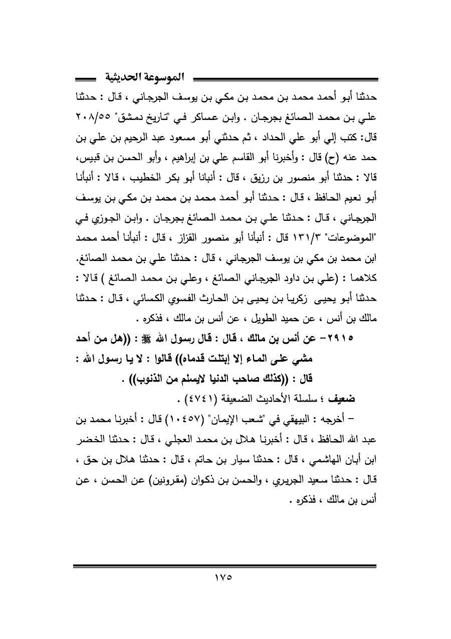 حدثنا أبو أحمد محمد بن محمد بن مكي بن يوسف الجرجاني، قال: حدثنا علي بن محمد الصائغ بجرجان. وابن عساكر في "تاريخ دمشق" ٥٥/ ٢٠٨ قال: كتب إلي أبو علي الحداد، ثم حدثني أبو مسعود عبد الرحيم بن علي بن حمد عنه (ح) قال: وأخبرنا أبو القاسم علي بن إبراهيم، وأبو الحسن بن قبيس، قالا: حدثنا أبو منصور بن رزيق، قال: أنبأنا أبو بكر الخطيب، قالا: أنبأنا أبو نعيم الحافظ، قال: حدثنا أبو أحمد محمد بن محمد بن مكي بن يوسف الجرجاني، قال: حدثنا علي بن محمد الصائغ بجرجان. وابن الجوزي في "الموضوعات" ٣/ ١٣١ قال: أنبأنا أبو منصور القزاز، قال: أنبأنا أحمد محمد ابن محمد بن مكي بن يوسف الجرجاني، قال: حدثنا علي بن محمد الصائغ. كلاهما: (علي بن داود الجرجاني الصائغ، وعلي بن محمد الصائغ) قالا: حدثنا أبو يحيى زكريا بن يحيى بن الحارث الفسوي الكسائي، قال: حدثنا مالك بن أنس، عن حميد الطويل، عن أنس بن مالك، فذكره.