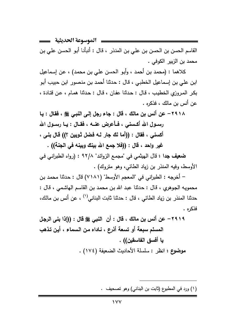 ٢٩١٩ - عن أنس بن مالك، قال: أن النبي - صلى الله عليه وسلم - قال: "إذا بنى الرجل المسلم سبعة أو تسعة أذرع، ناداه من السماء، أين تذهب يا أفسق الفاسقين".