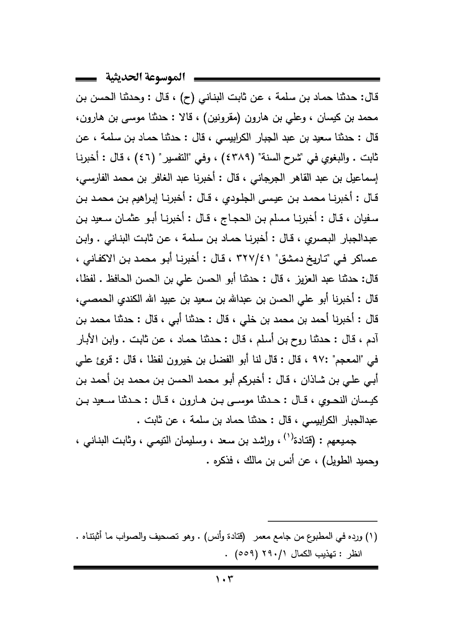 قال: حدثنا حماد بن سلمة، عن ثابت البناني (ح)، قال: وحدثنا الحسن بن محمد بن كيسان، وعلي بن هارون (مقرونين)، قالا: حدثنا موسى بن هارون، قال: حدثنا سعيد بن عبد الجبار الكرابيسي، قال: حدثنا حماد بن سلمة، عن ثابت. والبغوي في "شرح السنة" (٤٣٨٩)، وفي "التفسير" (٤٦)، قال: أخبرنا إسماعيل بن عبد القاهر الجرجاني، قال: أخبرنا عبد الغافر بن محمد الفارسي، قال: أخبرنا محمد بن عيسى الجلودي، قال: أخبرنا إبراهيم بن محمد بن سفيان، قال: أخبرنا مسلم بن الحجاج، قال: أخبرنا أبو عثمان سعيد بن عبد الجبار البصري، قال: أخبرنا حماد بن سلمة، عن ثابت البناني. وابن عساكر في "تاريخ دمشق" ٤١/ ٣٢٧، قال: أخبرنا أبو محمد بن الأكفاني، قال: حدثنا عبد العزيز، قال: حدثنا أبو الحسن علي بن الحسن الحافظ. لفظا، قال: أخبرنا أبو علي الحسن بن عبد الله بن سعيد بن عبيد الله الكندي الحمصي، قال: أخبرنا أحمد بن محمد بن خلي، قال: حدثنا أبي، قال: حدثنا محمد بن آدم، قال: حدثنا روح بن أسلم، قال: حدثنا حماد، عن ثابت. وابن الأبار في "المعجم":٩٧، قال: قال لنا أبو الفضل بن خيرون لفظا، قال: قرئ علي أبي علي بن شاذان، قال: أخبركم أبو محمد الحسن بن محمد بن أحمد بن كيسان النحوي، قال: حدثنا موسى بن هارون، قال: حدثنا سعيد بن عبد الجبار الكرابيسي، قال: حدثنا حماد بن سلمة، عن ثابت.