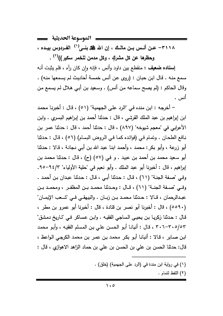 ٣١١٨ - عن أنس بن مالك، إن الله - عز وجل - بنى (¬١) الفردوس بيده، وحظرها عن كل مشركٍ، وكل مدمن للخمر سكير" (¬٢).