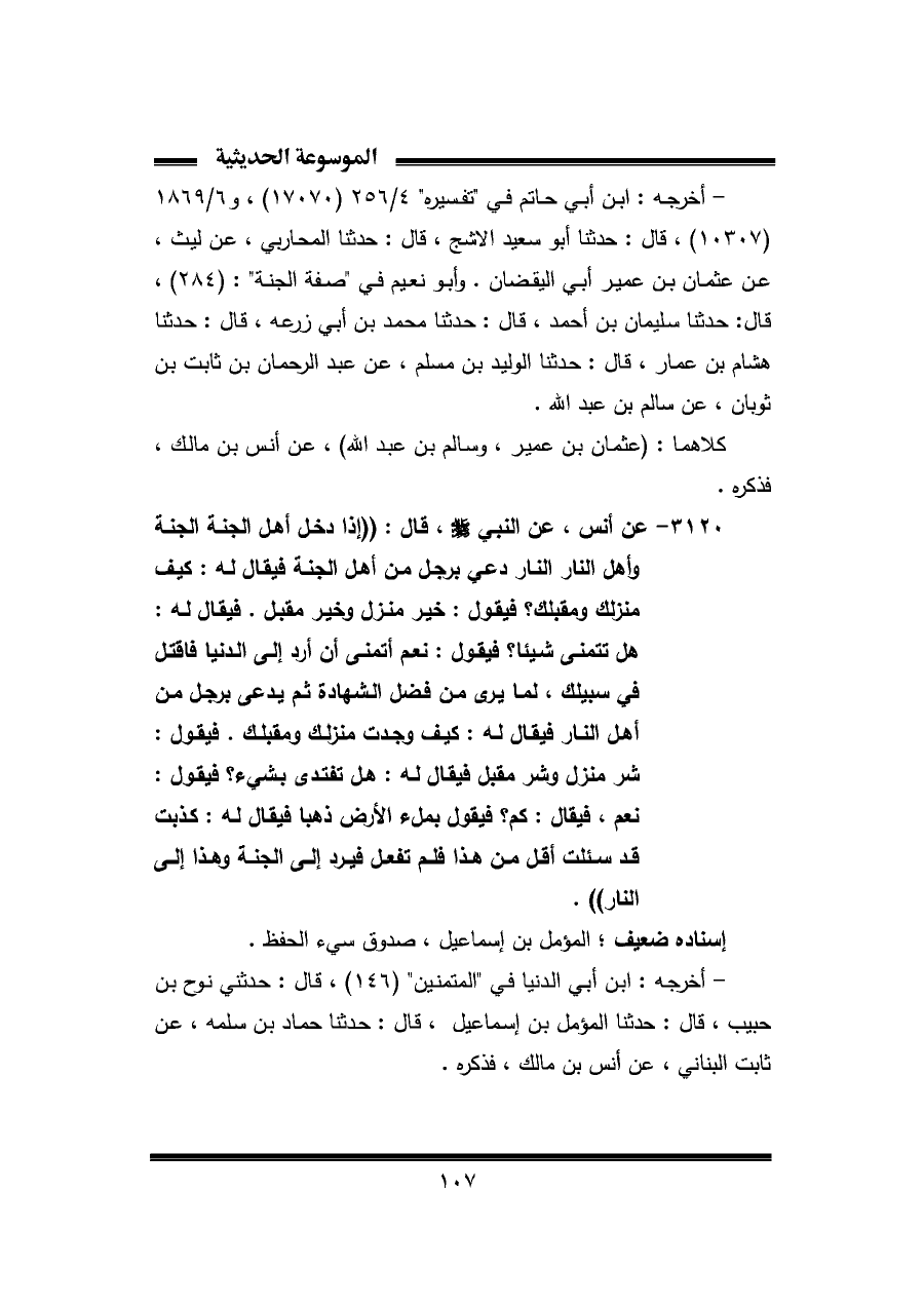 ٣١٢٠ - عن أنس، عن النبي - صلى الله عليه وسلم -، قال: "إذا دخل أهل الجنة الجنة وأهل النار النار دعي برجل من أهل الجنة فيقال له: كيف منزلك ومقبلك؟ فيقول: خير منزل وخير مقبل. فيقال له: هل تتمنى شيئا؟ فيقول: نعم أتمنى أن أرد إلى الدنيا فاقتل في سبيلك، لما يرى من فضل الشهادة ثم يدعى برجل من أهل النار فيقال له: كيف وجدت منزلك ومقبلك. فيقول: شر منزل وشر مقبل فيقال له: هل تفتدى بشيء؟ فيقول: نعم، فيقال: كم؟ فيقول بملء الأرض ذهبا فيقال له: كذبت قد سئلت أقل من هذا فلم تفعل فيرد إلى الجنة وهذا إلى النار".