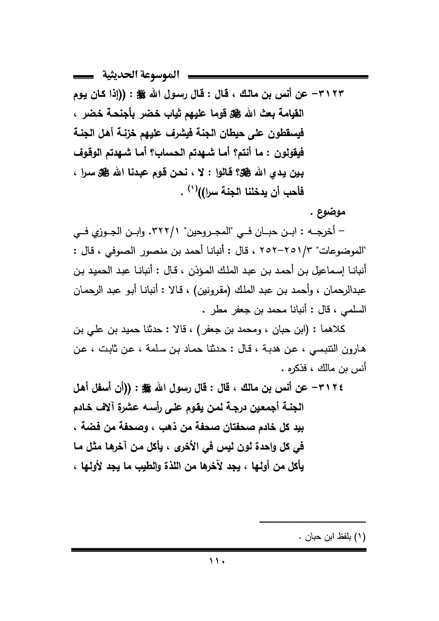٣١٢٣ - عن أنس بن مالك، قال: قال رسول الله - صلى الله عليه وسلم -: "إذا كان يوم القيامة بعث الله - عز وجل - قوما عليهم ثياب خضر بأجنحة خضر، فيسقطون على حيطان الجنة فيشرف عليهم خزنة أهل الجنة فيقولون: ما أنتم؟ أما شهدتم الحساب؟ أما شهدتم الوقوف بين يدي الله - عز وجل -؟ قالوا: لا، نحن قوم عبدنا الله - عز وجل - سرا، فأحب أن يدخلنا الجنة سرا" (¬١).