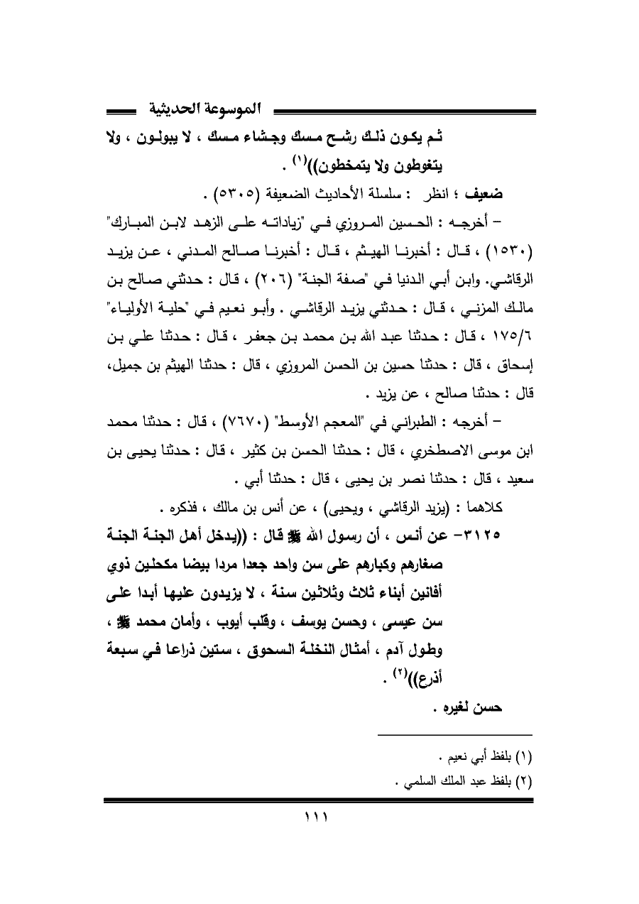 ٣١٢٥ - عن أنس، أن رسول الله - صلى الله عليه وسلم - قال: "يدخل أهل الجنة الجنة صغارهم وكبارهم على سن واحد جعدا مردا بيضا مكحلين ذوي أفانين أبناء ثلاث وثلاثين سنة، لا يزيدون عليها أبدا على سن عيسى، وحسن يوسف، وقلب أيوب، وأمان محمد - صلى الله عليه وسلم -، وطول آدم، أمثال النخلة السحوق، ستين ذراعا في سبعة أذرع" (¬٢).