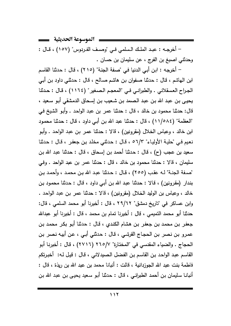 - أخرجه: ابن أبي الدنيا في "صفة الجنة" (٢١٥)، قال: حدثنا القاسم بن الهاشم، قال: حدثنا صفوان بن هاشم صالح، قال: حدثني داود بن أبي الجراح العسقلاني. والطبراني في "المعجم الصغير" (١١٦٤)، قال: حدثنا يحيى بن عبد الله بن عبد الصمد بن شعيب بن إسحاق الدمشقي أبو سعيد، قال: حدثنا محمود بن خالد، قال: حدثنا عمر بن عبد الواحد. وأبو الشيخ في "العظمة" (٥٨٤/ ١١)، قال: حدثنا عبد الله بن أبي داود، قال: حدثنا محمود بن خالد، وعباس الخلال (مقرونين)، قال: حدثنا عمر بن عبد الواحد. وأبو نعيم في "حلية الأولياء" ٣/ ٥٦، قال: حدثني مخلد بن جعفر، قال: حدثنا سعيد بن عجب (ح)، قال: حدثنا أحمد بن إسحاق، قال: حدثنا عبد الله بن سليمان، قال: حدثنا محمود بن خالد، قال: حدثنا عمر بن عبد الواحد. وفي "صفة الجنة" له عقب (٢٥٥)، قال: حدثنا عبد الله بن محمد، وأحمد بن بندار (مقرونين)، قال: حدثنا عبد الله بن أبي داود، قال: حدثنا محمود بن خالد، وعباس بن الوليد الخلال (مقرونين)، قالا: حدثنا عمر بن عبد الواحد. وابن عساكر في "تاريخ دمشق" ٦٢/ ٢٩، قال: أخبرنا أبو محمد السلمي، قال: حدثنا أبو محمد التميمي، قال: أخبرنا تمام بن محمد، قال: أخبرنا أبو عبد الله جعفر بن محمد بن جعفر بن هشام الكندي، قال: حدثنا أبو بكر محمد بن عمرو بن نصر بن الحجاج القرشي، قال: حدثني أبي، عن أبيه نصر بن الحجاج. والضياء المقدسي في "المختارة" ٧/ ٢٦٥ (٢٧١٦)، قال: أخبرنا أبو القاسم عبد الواحد بن القاسم بن الفضل الصيدلاني، قال: قيل له: أخبرتكم فاطمة بنت عبد الله الجوزدانية، قالت: أنبأنا محمد بن عبد الله بن ريذة، قال: أنبأنا سليمان بن أحمد الطبراني، قال: حدثنا أبو سعيد يحيى بن عبد الله بن