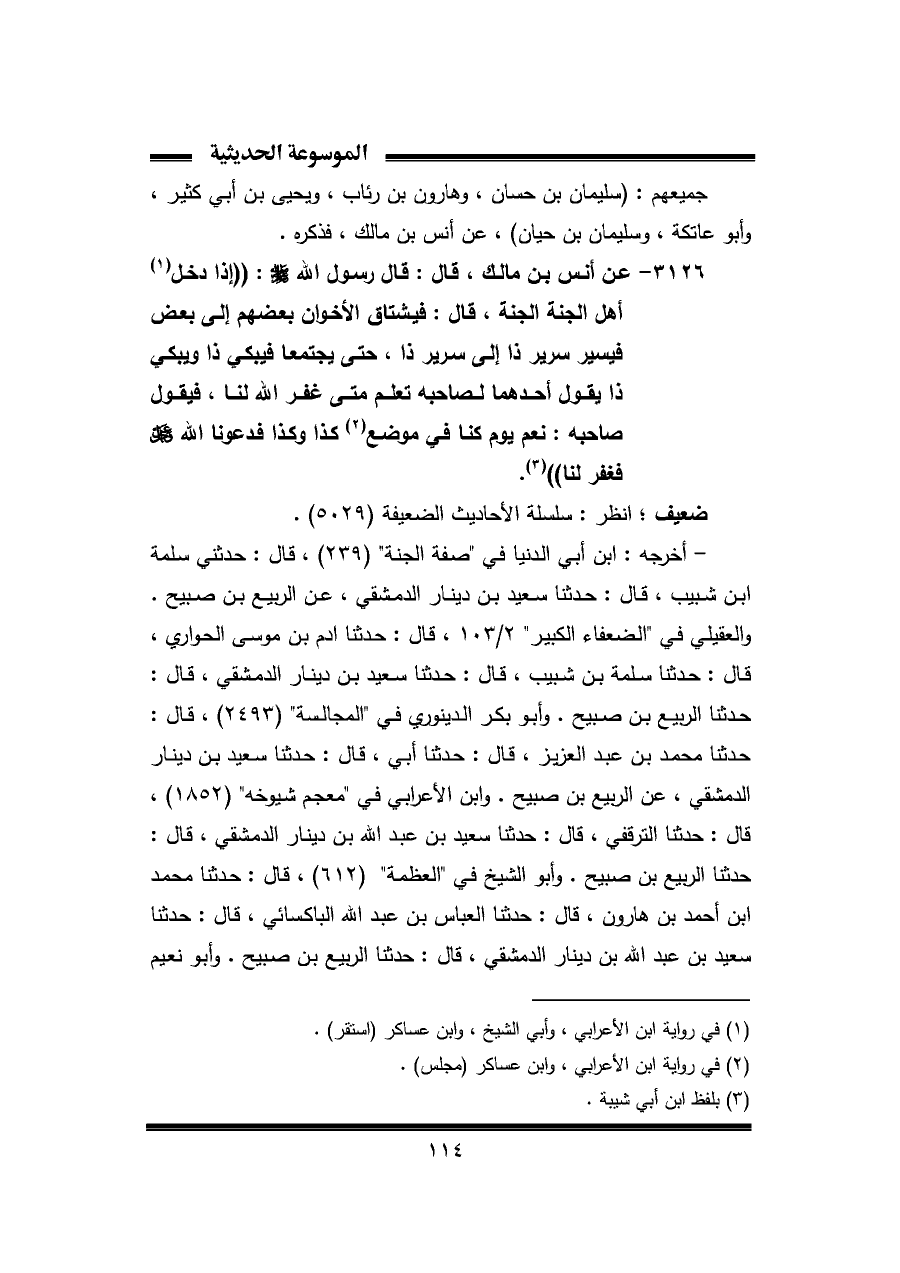 - أخرجه: ابن أبي الدنيا في "صفة الجنة" (٢٣٩)، قال: حدثني سلمة بن شبيب، قال: حدثنا سعيد بن دينار الدمشقي، عن الربيع بن صبيح. والعقيلي في "الضعفاء الكبير" ٢/ ١٠٣، قال: حدثنا آدم بن موسى الحواري، قال: حدثنا سلمة بن شبيب، قال: حدثنا سعيد بن دينار الدمشقي، قال: حدثنا الربيع بن صبيح. وأبو بكر الدينوري في "المجالسة" (٢٤٩٣)، قال: حدثنا محمد بن عبد العزيز، قال: حدثنا أبي، قال: حدثنا سعيد بن دينار الدمشقي، عن الربيع بن صبيح. وابن الأعرابي في "معجم شيوخه" (١٨٥٢)، قال: حدثنا الترقفي، قال: حدثنا سعيد بن عبد الله بن دينار الدمشقي، قال: حدثنا الربيع بن صبيح. وأبو الشيخ في "العظمة" (٦١٢)، قال: حدثنا محمد بن أحمد بن هارون، قال: حدثنا العباس بن عبد الله الباكسائي، قال: حدثنا سعيد بن عبد الله بن دينار الدمشقي، قال: حدثنا الربيع بن صبيح. وأبو نعيم