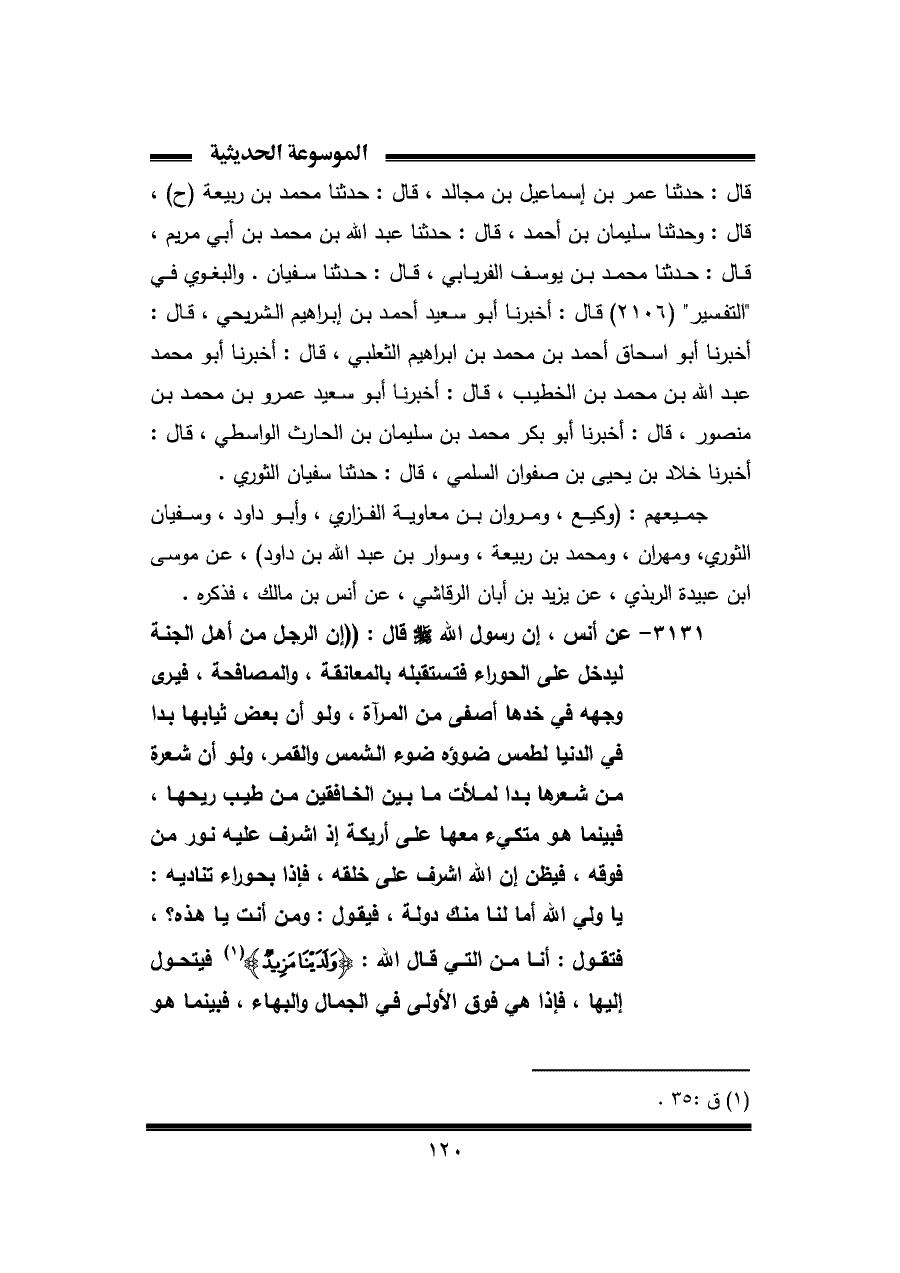 ٣١٣١ - عن أنس، إن رسول الله - صلى الله عليه وسلم - قال: "إن الرجل من أهل الجنة ليدخل على الحوراء فتستقبله بالمعانقة، والمصافحة، فيرى وجهه في خدها أصفى من المرآة، ولو أن بعض ثيابها بدا في الدنيا لطمس ضوؤه ضوء الشمس والقمر، ولو أن شعرة من شعرها بدا لملأت ما بين الخافقين من طيب ريحها، فبينما هو متكيء معها على أريكة إذ أشرف عليه نور من فوقه، فيظن أن الله أشرف على خلقه، فإذا بحوراء تناديه: يا ولي الله أما لنا منك دولة، فيقول: ومن أنت يا هذه؟، فئقول: أنا من التي قال الله: {وَلَدَيْنَا مَزِيدٌ} (¬١) فيتحول إليها، فإذا هي فوق الأولى في الجمال والبهاء، فبينما هو