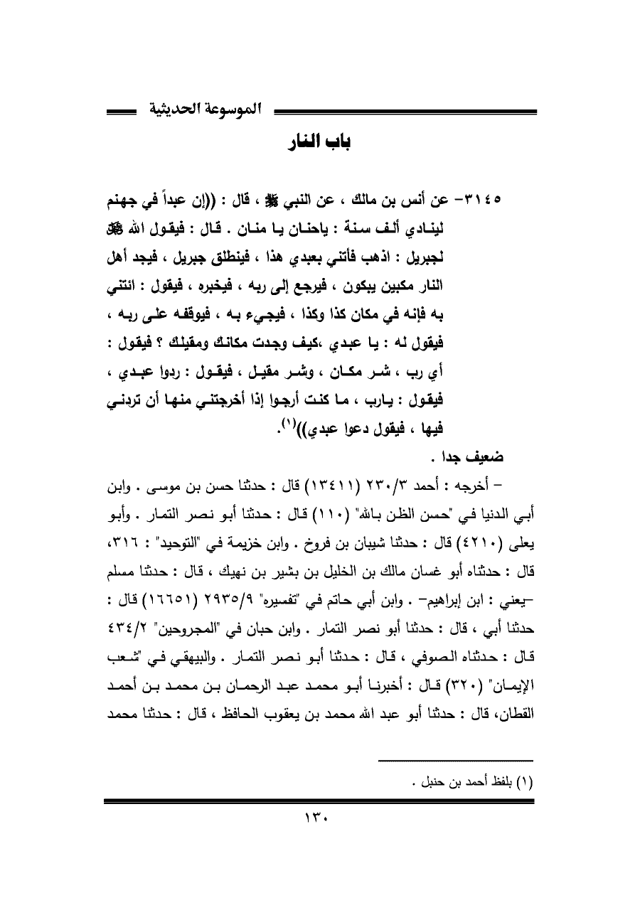٣١٤٥ - عن أنس بن مالك، عن النبي - صلى الله عليه وسلم -، قال: "إن عبدًا في جهنم لينادي ألف سنة: يا حنان يا منان. قال: فيقول الله عز وجل لجبريل: اذهب فأتني بعبدي هذا، فينطلق جبريل، فيجد أهل النار مكبين يبكون، فيرجع إلى ربه، فيخبره، فيقول: ائتني به فإنه في مكان كذا وكذا، فيجيء به، فيوقفه على ربه، فيقول له: يا عبدي، كيف وجدت مكانك ومقيلك؟ فيقول: أي رب، شر مكان، وشر مقيل، فيقول: ردوا عبدي، فيقول: يارب، ما كنت أرجوا إذا أخرجتني منها أن تردني فيها، فيقول دعوا عبدي" (¬١).