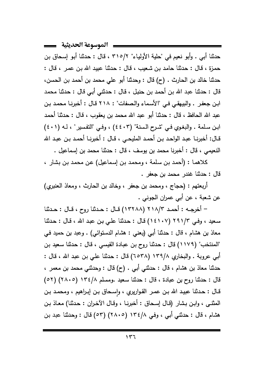 حدثنا أبي. وأبو نعيم في "حلية الأولياء" ٢/ ٣١٥، قال: حدثنا أبو إسحاق بن حمزة، قال: حدثنا حامد بن شعيب، قال: حدثنا عبيد الله بن عمر، قال: حدثنا خالد بن الحارث. (ح) قال: وحدثنا أبو علي محمد بن أحمد بن الحسن، قال: حدثنا عبد الله بن أحمد بن حنبل، قال: حدثني أبي قال: حدثنا محمد بن جعفر. والبيهقي في "الأسماء والصفات": ٢١٨ قال: أخبرنا محمد بن عبد الله الحافظ، قال: حدثنا أبو عبد الله محمد بن يعقوب، قال: حدثنا أحمد بن سلمة. والبغوي في "شرح السنة" (٤٤٠٣)، وفي "التفسير"، له (٤٠١) قال: أخبرنا عبد الواحد بن أحمد المليحي، قال: أخبرنا أحمد بن عبد الله النعيمي، قال: أخبرنا محمد بن يوسف، قال: حدثنا محمد بن إسماعيل.