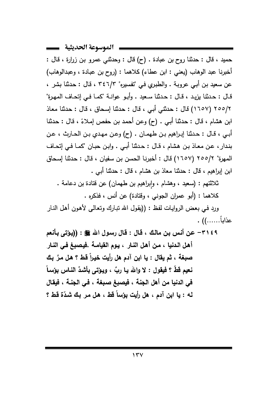 ٣١٤٩ - عن أنس بن مالك، قال: قال رسول الله - صلى الله عليه وسلم -: "يؤتى بأنعم أهل الدنيا، من أهل النار، يوم القيامة. فيصبغ في النار صبغة، ثم يقال: يا ابن آدم هل أريت خيرًا قط؟ هل مرَّ بك نعيم قطّ؟ فيقول: لا والله يا ربِّ، ويؤتى بأشدِّ الناس بؤسًا في الدنيا من أهل الجنة، فيصبغ صبغة، في الجنة، فيقال له: يا ابن آدم، هل رأيت بؤسًا قط، هل مر بك شدّة قط؟