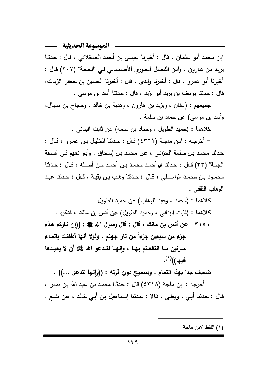 ابن محمد أبو عثمان، قال: أخبرنا عيسى بن أحمد العسقلاني، قال: حدثنا يزيد بن هارون. وابن الفضل الجوزي الأصبهاني في "الحجة" (٢٠٧) قال: أخبرنا أبو عمرو، قال: أخبرنا والدي، قال: أخبرنا الحسين بن جعفر الزيات، قال: حدثنا يوسف بن يزيد أبو يزيد، قال: حدثنا أسد بن موسى.