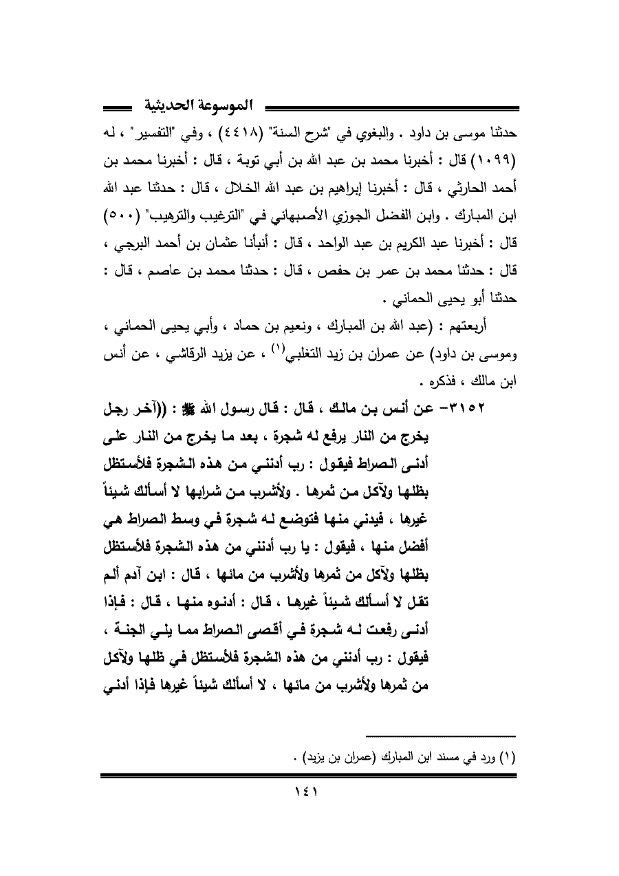 ٣١٥٢ - عن أنس بن مالك، قال: قال رسول الله - صلى الله عليه وسلم -: "آخر رجل يخرج من النار يرفع له شجرة، بعد ما يخرج من النار على أدنى الصراط فيقول: رب أدنني من هذه الشجرة فلأستظل بظلها ولآكل من ثمرها. ولأشرب من شرابها لا أسألك شيئًا غيرها، فيدني منها فتوضع له شجرة في وسط الصراط هي أفضل منها، فيقول: يا رب أدنني من هذه الشجرة فلأستظل بظلها ولآكل من ثمرها ولأشرب من مائها، قال: ابن آدم ألم تقل لا أسألك شيئًا غيرها، قال: أدنوه منها، قال: فإذا أدنى رفعت له شجرة في أقصى الصراط مما يلي الجنة، فيقول: رب أدنني من هذه الشجرة فلأستظل في ظلها ولآكل من ثمرها ولأشرب من مائها، لا أسألك شيئًا غيرها فإذا أدني
