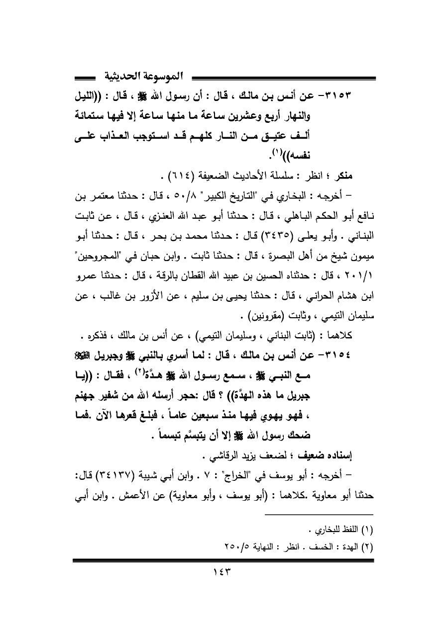 ٣١٥٤ - عن أنس بن مالك، قال: لما أسري بالنبي - صلى الله عليه وسلم - وجبريل عليه السلام مع النبي - صلى الله عليه وسلم -، سمع رسول الله - صلى الله عليه وسلم - هدَّة (¬٢)، فقال: "يا جبريل ما هذه الهدَّة"؟ قال: حجر أرسله الله من شفير جهنم، فهو يهوي فيها منذ سبعين عامًا، فبلغ قعرها الآن. فما ضحك رسول الله - صلى الله عليه وسلم - إلا أن يتبسَّم تبسمًا.