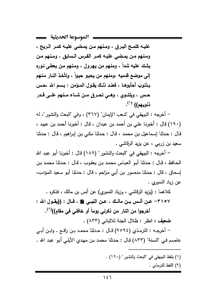 عليه كلمح البرق، ومنهم من يمضي عليه كمر الريح، ومنهم من يمضي عليه كمر الفرس السابق، ومنهم من يشتد عليه شدًا، ومنهم من يهرول، ومنهم من يعطى نوره إلى موضع قدميه، ومنهم من يحبو حبوًا، وتأخذ النار منهم بذنوب أحابوها، فعند ذلك يقول المؤمن: بسم الله، حس حس، ويلتوي، وهي ئحرق من شاء منهم على قدر ذنوبهم" (¬١).