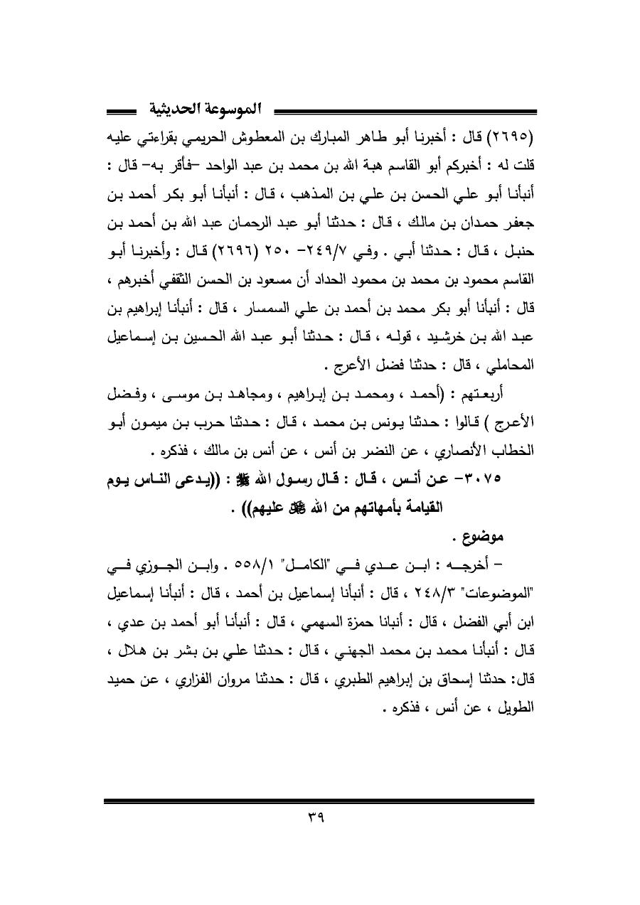 (٢٦٩٥) قال: أخبرنا أبو طاهر المبارك بن المعطوش الحريمي بقراءتي عليه قلت له: أخبركم أبو القاسم هبة الله بن محمد بن عبد الواحد - فأقر به - قال: أنبأنا أبو علي الحسن بن علي بن المذهب، قال: أنبأنا أبو بكر أحمد بن جعفر حمدان بن مالك، قال: حدثنا أبو عبد الرحمان عبد الله بن أحمد بن حنبل، قال: حدثنا أبي. وفي ٧/ ٢٤٩ - ٢٥٠ (٢٦٩٦) قال: وأخبرنا أبو القاسم محمود بن محمد بن محمود الحداد أن مسعود بن الحسن الثقفي أخبرهم، قال: أنبأنا أبو بكر محمد بن أحمد بن علي السمسار، قال: أنبأنا إبراهيم بن عبد الله بن خرشيد، قوله، قال: حدثنا أبو عبد الله الحسين بن إسماعيل المحاملي، قال: حدثنا فضل الأعرج.