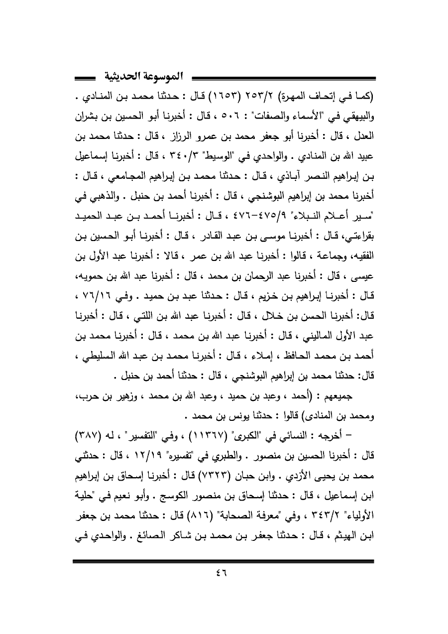 (كما في إتحاف المهرة) ٢/ ٢٥٣ (١٦٥٣) قال: حدثنا محمد بن المنادي. والبيهقي في "الأسماء والصفات": ٥٠٦ , قال أخبرنا أبو الحسين بن بشران العدل، قال: أخبرنا أبو جعفر محمد بن عمرو الرزاز، قال: حدثنا محمد بن عبيد الله بن المنادي. والواحدي في "الوسيط" ٣/ ٣٤٠، قال: أخبرنا إسماعيل ن إبراهيم النصر آباذي، قال: حدثنا محمد بن إبراهيم المجامعي، قال: أخبرنا محمد بن إبراهيم البوشنجي، قال: أخبرنا أحمد بن حنبل. والذهبي في "سير أعلام النبلاء" ٩/ ٤٧٥ - ٤٧٦، قال: أخبرنا أحمد بن عبد الحميد بقراءتي، قال: أخبرنا موسى بن عبد القادر، قال: أخبرنا أبو الحسين بن الفقيه، وجماعة، قالوا: أخبرنا عبد الله بن عمر، قالا: أخبرنا عبد الأول بن عيسى، قال: أخبرنا عبد الرحمان بن محمد، قال: أخبرنا عبد الله بن حمويه، قال: أخبرنا إبراهيم بن خزيم، قال: حدثنا عبد بن حميد. وفي ١٦/ ٧٦، قال: أخبرنا الحسن بن خلال، قال: أخبرنا عبد الله بن اللتي، قال: أخبرنا عبد الأول الماليني، قال: أخبرنا عبد الله بن محمد، قال: أخبرنا محمد بن أحمد بن محمد الحافظ، إملاء، قال: أخبرنا محمد بن عبد الله السليطي، قال: حدثنا محمد بن إبراهيم البوشنجي، قال: حدثنا أحمد بن حنبل.
