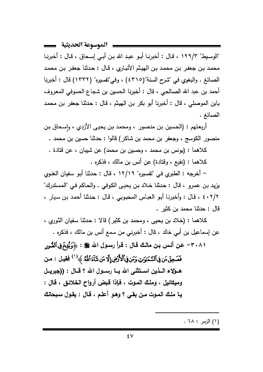 ٣٠٨١ - عن أنس بن مالك قال: قرأ رسول الله - صلى الله عليه وسلم -: {وَنُفِخَ فِي الصُّورِ فَصَعِقَ مَنْ فِي السَّمَاوَاتِ وَمَنْ فِي الْأَرْضِ إِلَّا مَنْ شَاءَ اللَّهُ} (¬١) فقيل: من هؤلاء الذين استثنى الله يا رسول الله؟ قال: "جبريل وميكائيل، وملك الموت، فإذا قبض أرواح الخلائق، قال: يا ملك الموت من بقي؟ وهو أعلم، قال: يقول سبحانك