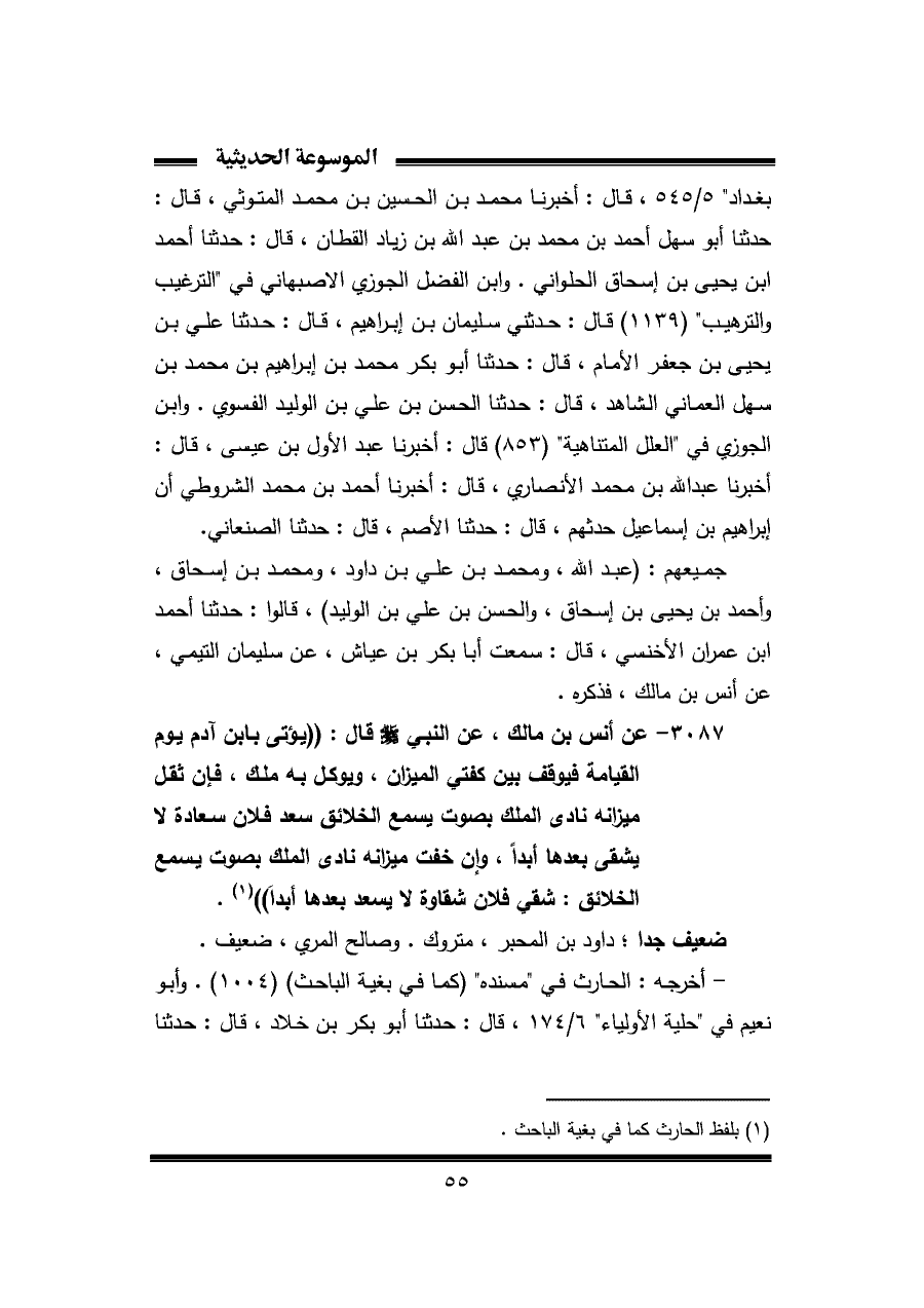 بغداد" ٥/ ٥٤٥، قال: أخبرنا محمد بن الحسين بن محمد المتوثي، قال: حدثنا أبو سهل أحمد بن محمد بن عبد الله بن زياد القطان، قال: حدثنا أحمد بن يحيى بن إسحاق الحلواني. وابن الفضل الجوزي الأصبهاني في "الترغيب والترهيب" (١١٣٩) قال: حدثني سليمان بن إبراهيم، قال: حدثنا علي بن يحيى بن جعفر الإمام، قال: حدثنا أبو بكر محمد بن إبراهيم بن محمد بن سهل العماني الشاهد، قال: حدثنا الحسن بن علي بن الوليد الفسوي. وابن الجوزي في "العلل المتناهية" (٨٥٣) قال: أخبرنا عبد الأول بن عيسى، قال: أخبرنا عبد الله بن محمد الأنصاري، قال: أخبرنا أحمد بن محمد الشروطي أن إبراهيم بن إسماعيل حدثهم، قال: حدثنا الأصم، قال: حدثنا الصنعاني.